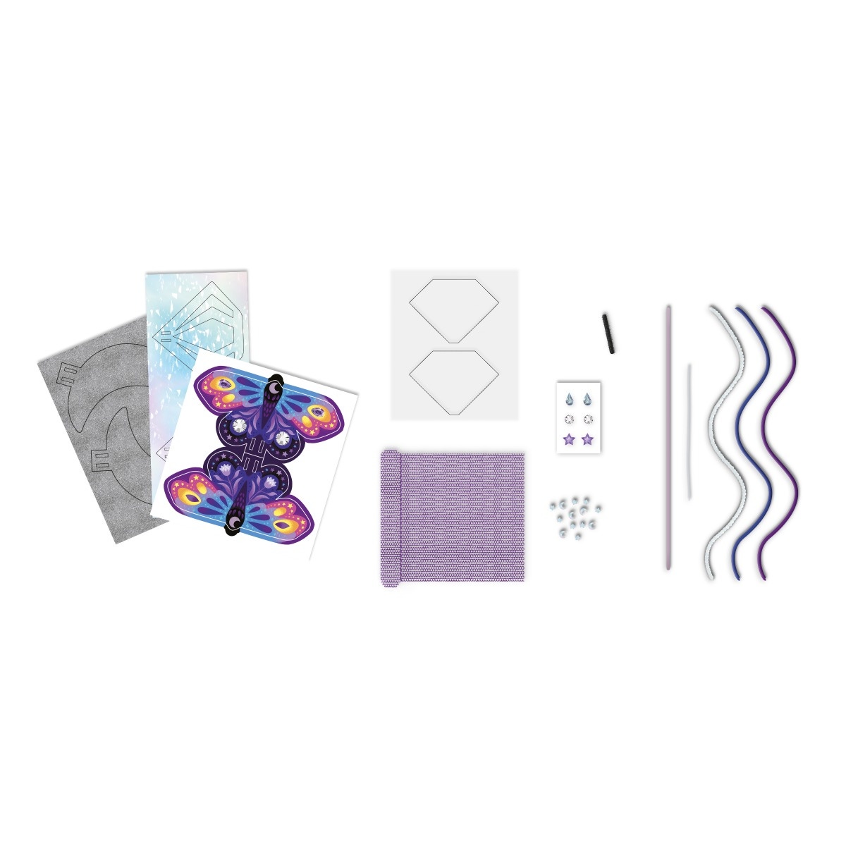 Abracadabra ! Ce kit créatif permet de réaliser 3 baguettes de sorcières ! Il est composé d'une planche prédécoupée pailletée argentée, 1 planche prédécoupée holographique, 1 planche prédécoupée imprimée, 1 planche prédécoupée transparente, du tulle violet, 45 sequins étoiles et lunes, 6 sequins autocollants, 1 fil chenille noir, 3 baguettes en bois teinté, 1 ruban de sequins argentés, 2 rubans de satin (bleu et violet), 1 fil élastique, 3 carrés de mousse autocollante et 1 livret avec les instructions et les modèles. Cette activité permet de développer sa créativité et sa motricité fine et est idéale pour les enfants à partir de 7 ans.