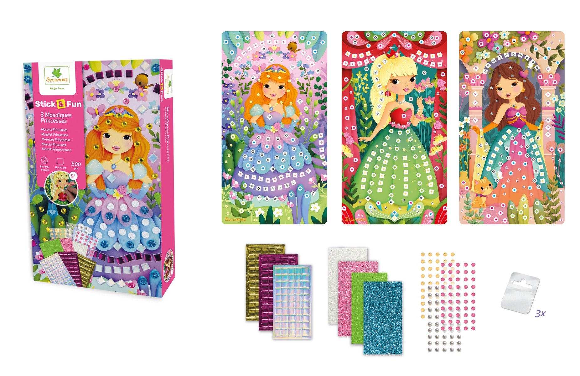 Crée de magnifiques décorations scintillantes avec le coffret Stick & fun 3 mosaïques Princesses Sycomore !
