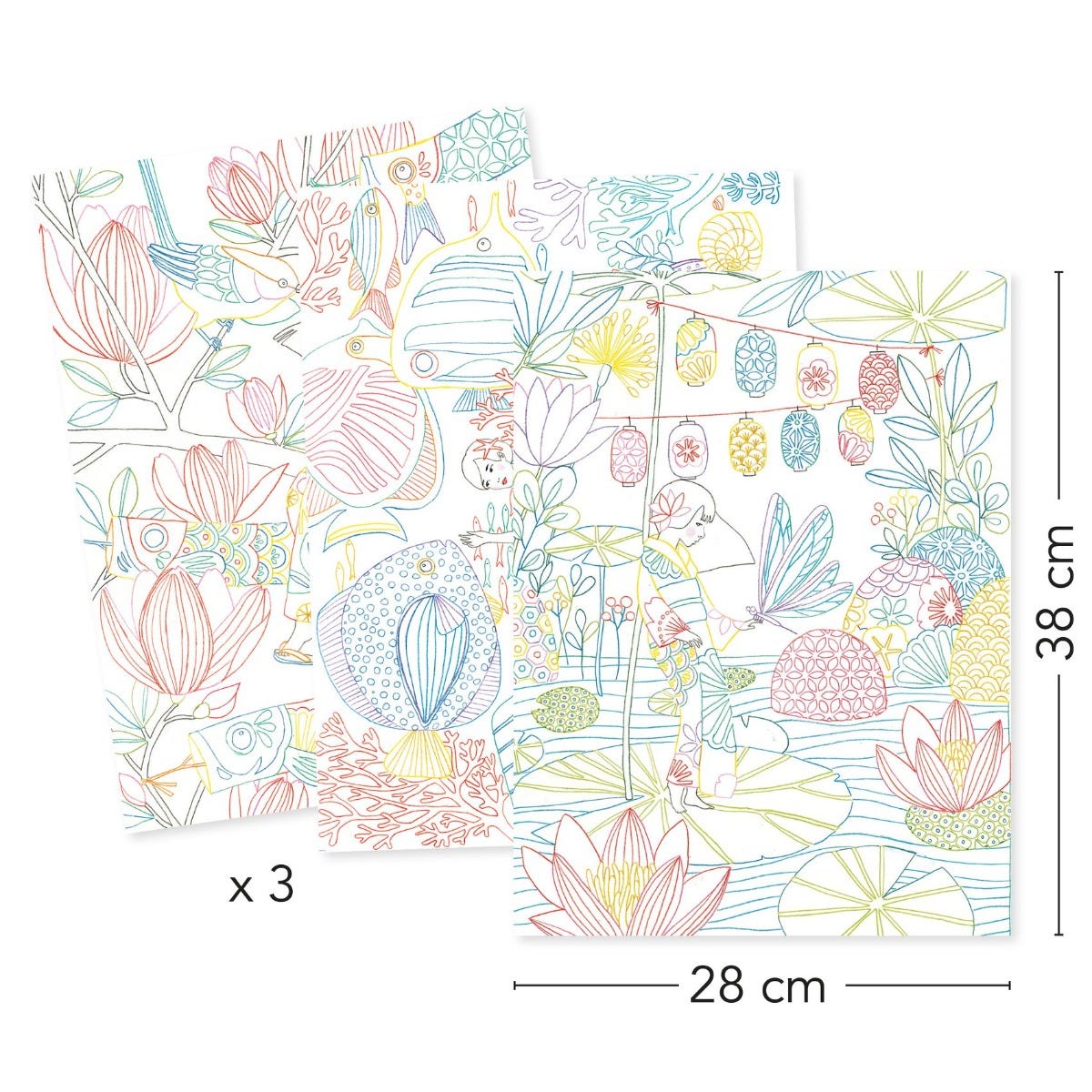 | Contenu du produit | 1 pochette cartonnée avec des encoches et 3 posters illustrés à colorier (38 x 28 cm). |