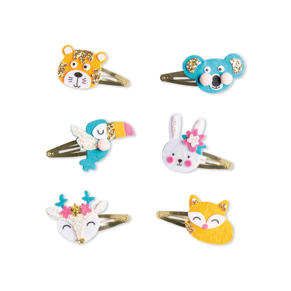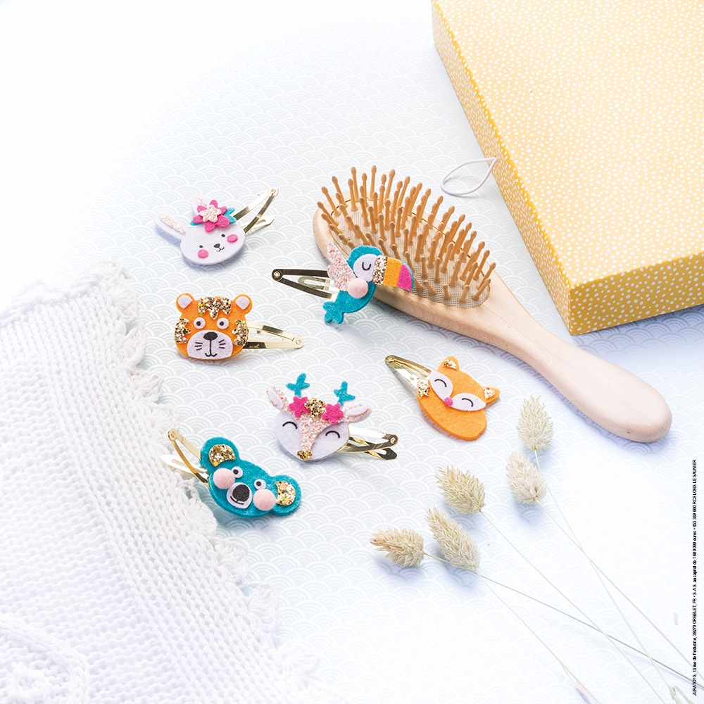 Attache tes cheveux avec des petits animaux trop mignons ! Ce coffret permet de réaliser 6 barrettes animaux pailletés. Il se compose de 6 supports de barrettes dorés, 1 coupon de feutrine autocollante blanche prédécoupée et imprimée, 3 coupons de feutrine autocollante prédécoupée ( bleue, orange, fusina), 2 coupons de tissu pailleté autocollant (rose clair, or), 3 pompons rose, 3 pastilles autocollantes et 1 livret avec les instructions et les modèles. Le livret d'instructions permettra aux enfants d'assembler les éléments en feutrine et en tissu pailleté pour donner vie à ces adorables animaux ! Environ 1h30 est nécessaire pour réaliser les 6 barrettes. Développant la motricité fine et la dextérité, ce kit est idéal à partir de 6 ans.