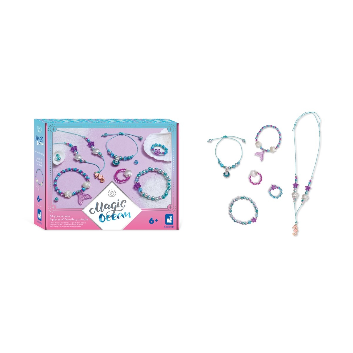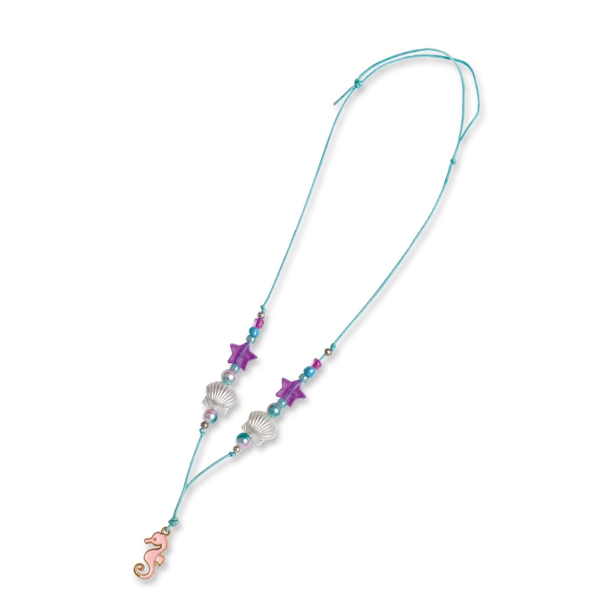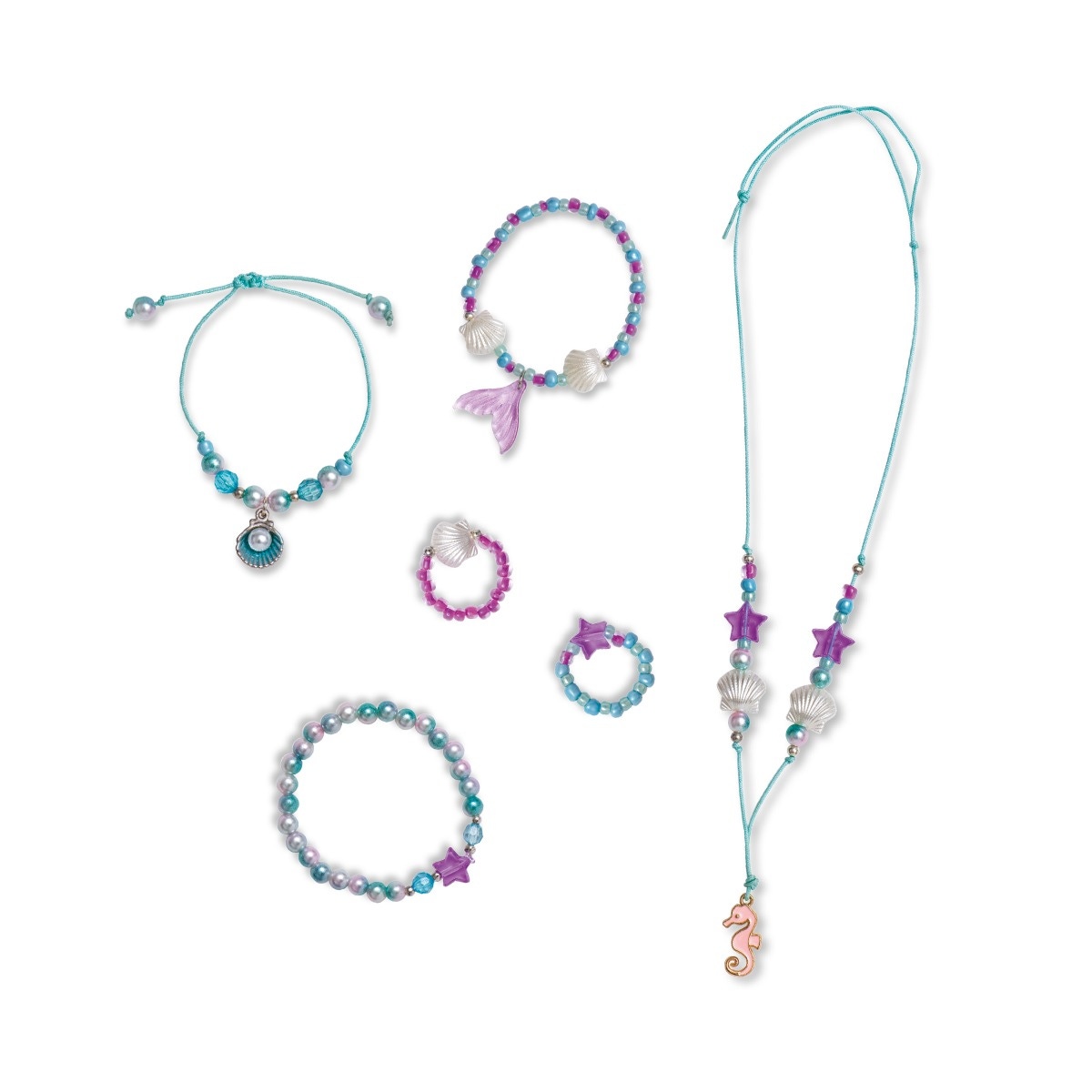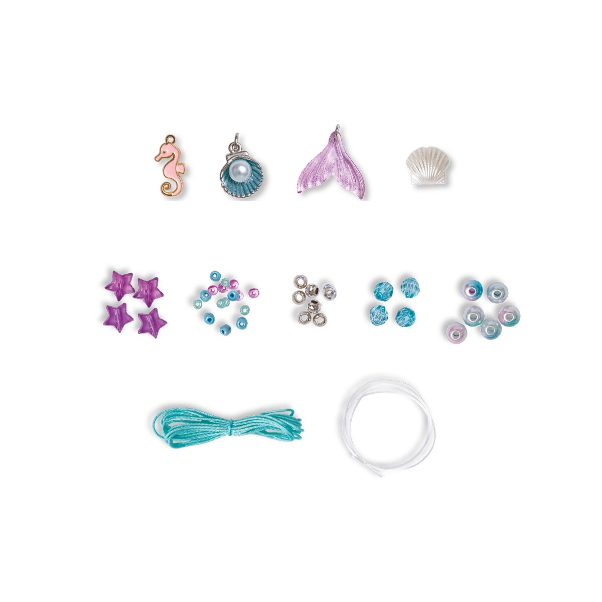 Créé tes bijoux fantaisies et entre dans l'univers des sirènes ! Ce coffret est composé de 105 perles de rocaille (bleues, vertes et violettes), 34 perles irisées, 15 perles argentées, 5 perles coquillages irisés, 4 perles à facettes, 4 perles étoiles, 3 breloques (hippocampe, coquillage et queue de sirène), 1 fil de jade bleu, 1 fil élastique et 1 livret avec les instructions et les modèles. Ce contenu très riche permet de créer 6 bijoux dont 2 bagues, 3 bracelets et 1 collier. Idéale pour développer sa créativité et sa motricité fine, ce coffret est recommandé pour les enfants à partir de 6 ans.