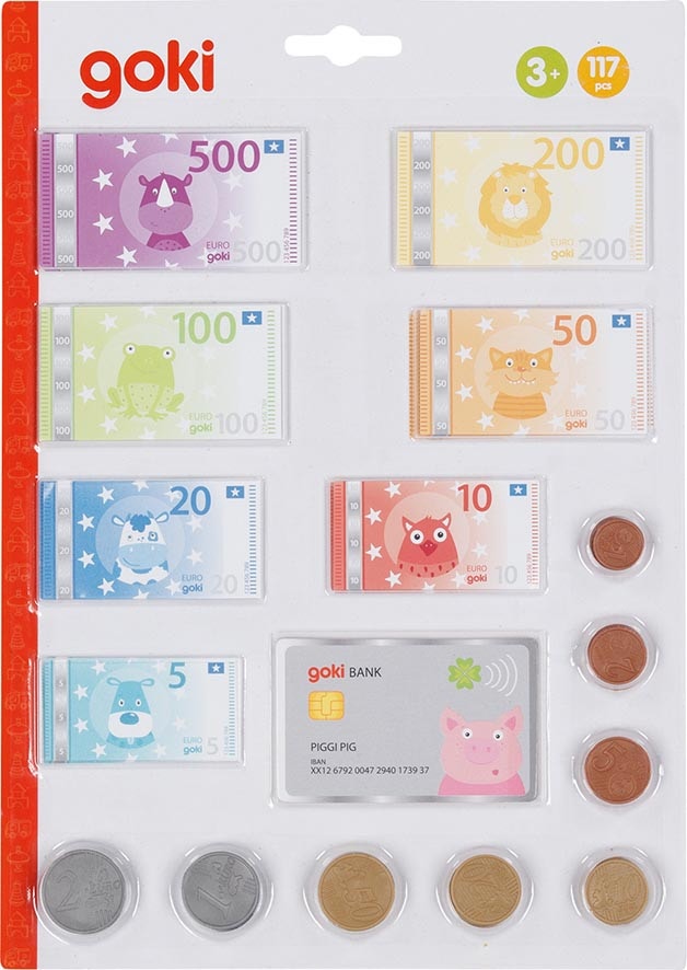 Apprendre à compter et à utiliser l'argent tout en s'amusant : comment pourrait-on jouer à la marchande sans monnaie ? Les interactions sociales sont également apprises par les enfants au cours du jeu par l'imitation des situations quotidiennes. Contient des billets, des pièces et une carte bancaire illustrés avec d'adorables animaux.