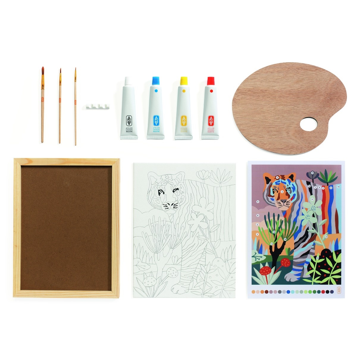 | Contenu du produit | 1 toile imprimée avec les contours de l'illustration, à peindre (format 290 x 220 mm) 4 tubes de peinture acrylique 1 palette en bois 3 pinceaux 1 support pour pinceaux 1 cadre en bois |