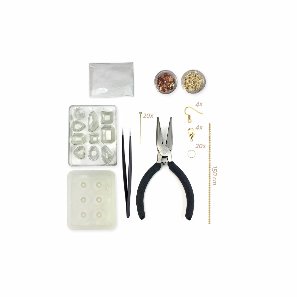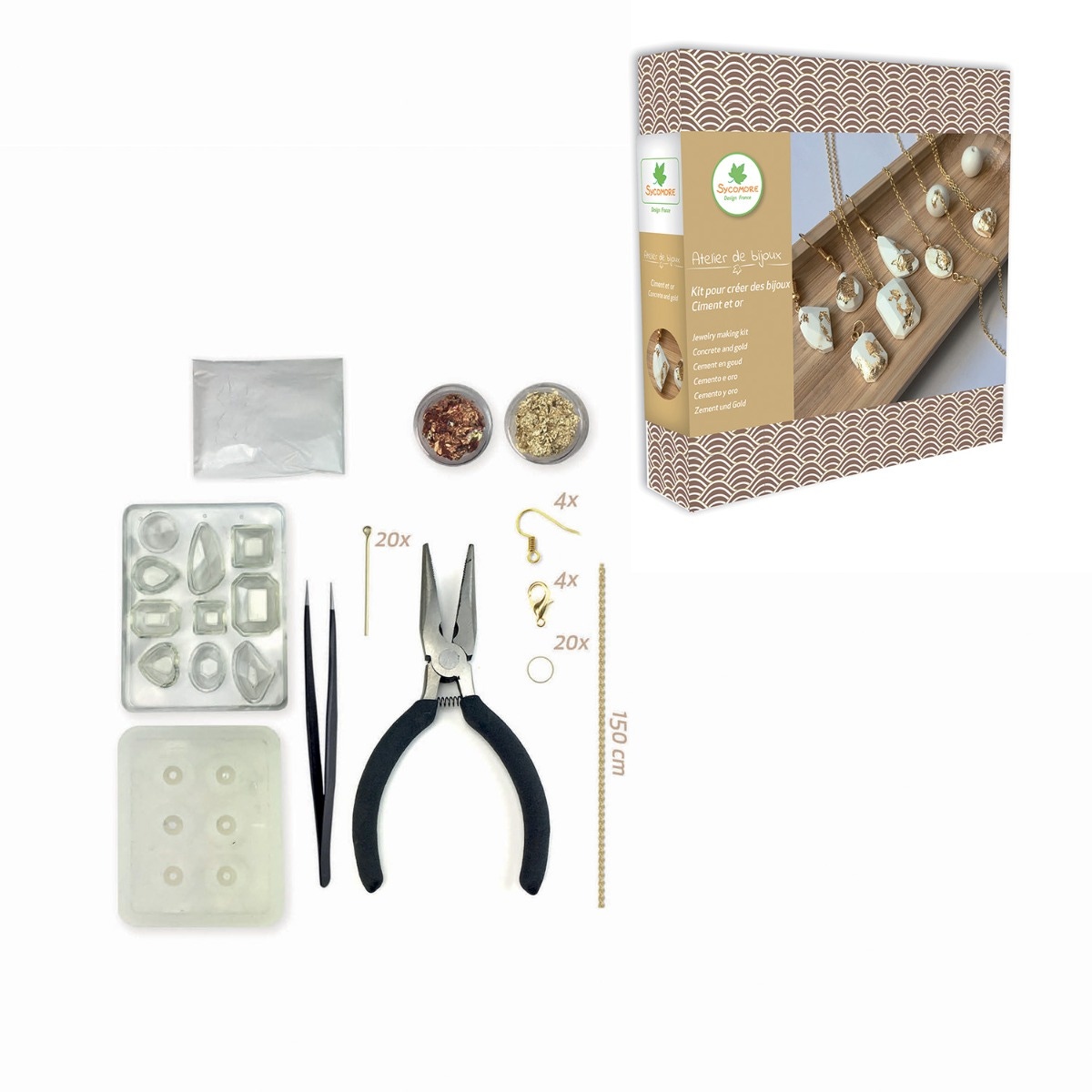 | Contenu du produit | 2 moules, ciment blanc, feuilles d'or et cuivre, chaîne, 4 fermoirs, 20 anneaux, 4 boucles d'oreilles, 20 clous, outil pour bijoux, pincette |