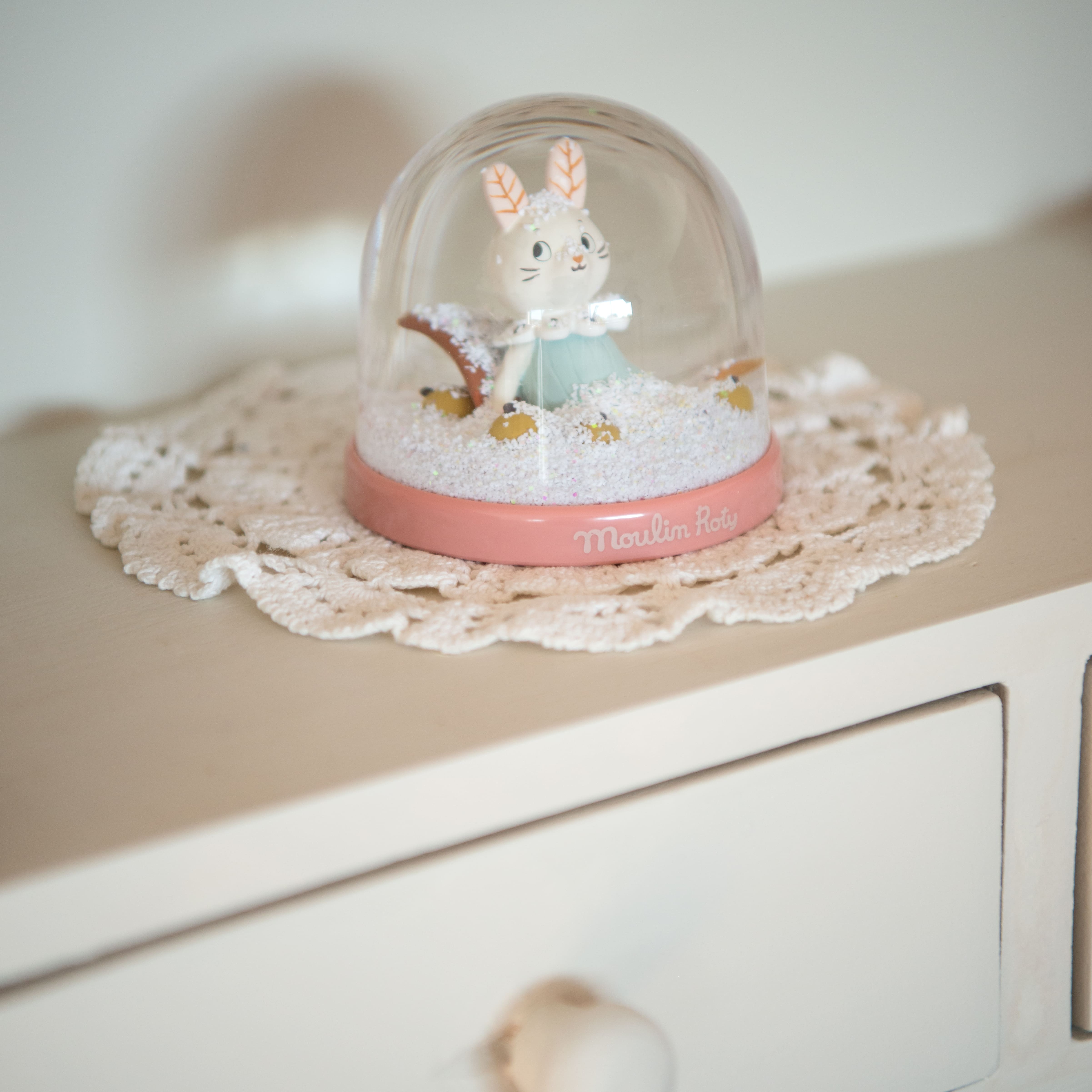 Boule à neige avec figurine en résine et socle en plastique où un adorable lapin posé dans une feuille d'automne, regarde les flocons tomber tout autour de lui…