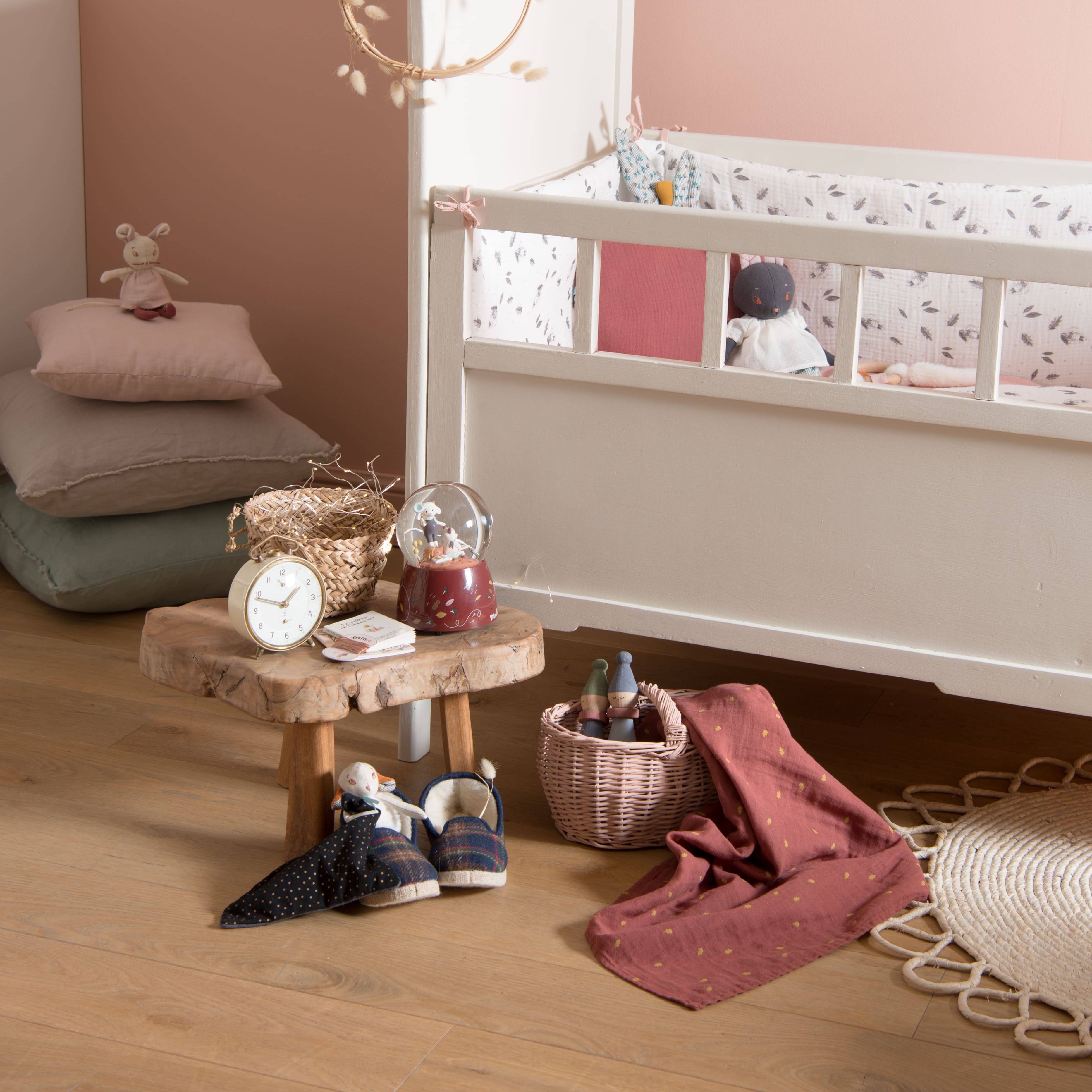 Boule à neige musicale avec Brume en pleine lecture, et Nuage debout pour attraper les paillettes brillantes ! En plus de décorer sa chambre, une jolie mélodie viendra bercer bébé au moment du coucher…