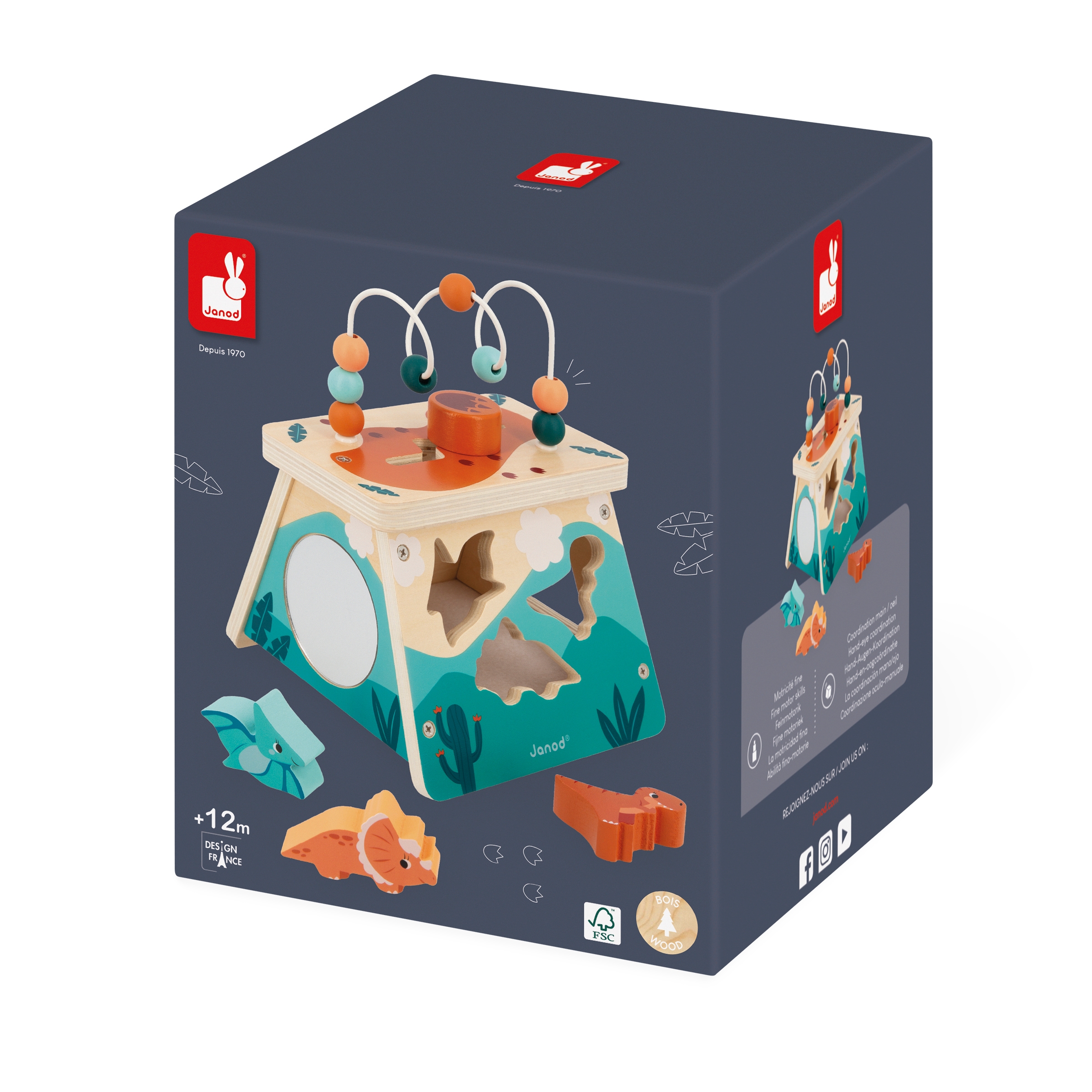 Faites découvrir tout en douceur le monde des dinosaures à votre enfant à travers ce volcan multi-activités. Sur la face de devant vous retrouverez une boite à forme avec un tyrannosaure, un tricératops et un ptéranodon à encastrer dans la forme correspondante. Les dinosaures ne font pas de bruit quand ils tombent grâce à la feutrine installée au fond de la boite. Votre enfant pourra facilement récupérer les pièces grâce à une grande ouverture sur le côté. La face de derrière propose trois engrenages à tourner, sur le côté gauche un miroir et pour finir sur le haut de ce volcan multi-activités se trouvent un labyrinthe et un boulier et ses perles en bois. Ces 5 activités, aideront votre enfant à développer sa motricité fine, sa dextérité et sa curiosité. Jouet en bois FSC™. Jouet d’éveil pour les enfants à partir de 12 mois.