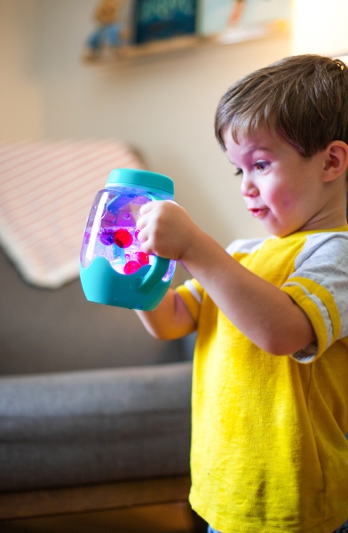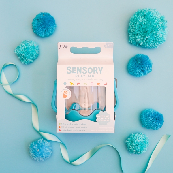 Découvrez la bouteille sensorielle bleue Glo Pals ! Il suffit de la remplir d'eau pour que la magie opère.