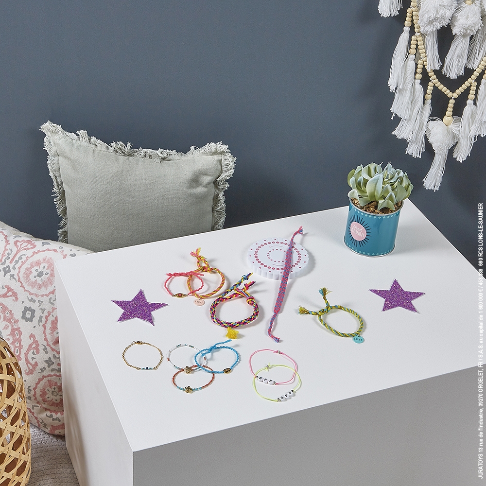 Coffret bracelets de l'amitié à créer de chez Janod, une activité manuelle pour les enfants dès 8 ans. Ce coffret contient les instructions et le matériel nécessaires pour réaliser 13 bracelets de l’amitié. De nombreux accessoires sont inclus : des fils de différentes couleurs et différentes textures, des breloques, des mini perles, des perles lettres, des pendentifs de différentes formes et surtout, une roue pour aider à la réalisation des bracelets à tisser.