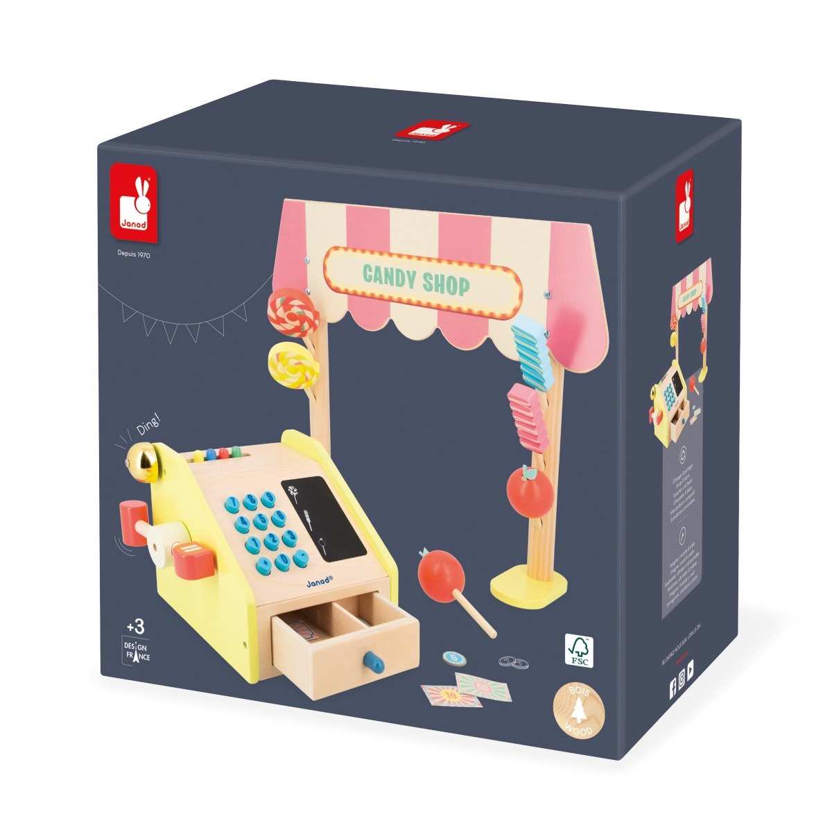 Qui veut une pomme d'amour bien caramélisée ? Vous préférez un bonbon ? Nous avons tout ce qu'il vous faut avec cette jolie marchande ! Composée, d'un stand à bonbon, de 6 bonbons et d'une caisse enregistreuse, ce jouet d'imitation est idéal pour imiter les plus grands ! La caisse enregistreuse a tout d'une vraie : des boutons en plastique pour calculer le montant, un tableau pour noter la commande, accompagné de son set de craies et enfin des billets et des pièces en carton à ranger dans le tiroir de la marchande. Dès qu'un article est réglé, l'enfant referme le tiroir et la clochette retentie, c'est payé ! Cette marchande promet des heures de jeu, entre amis, et en famille, parfaite pour développer l'imagination de votre enfant. Jouet d’imitation en bois FSC™.. Pour les enfants à partir de 3 ans.