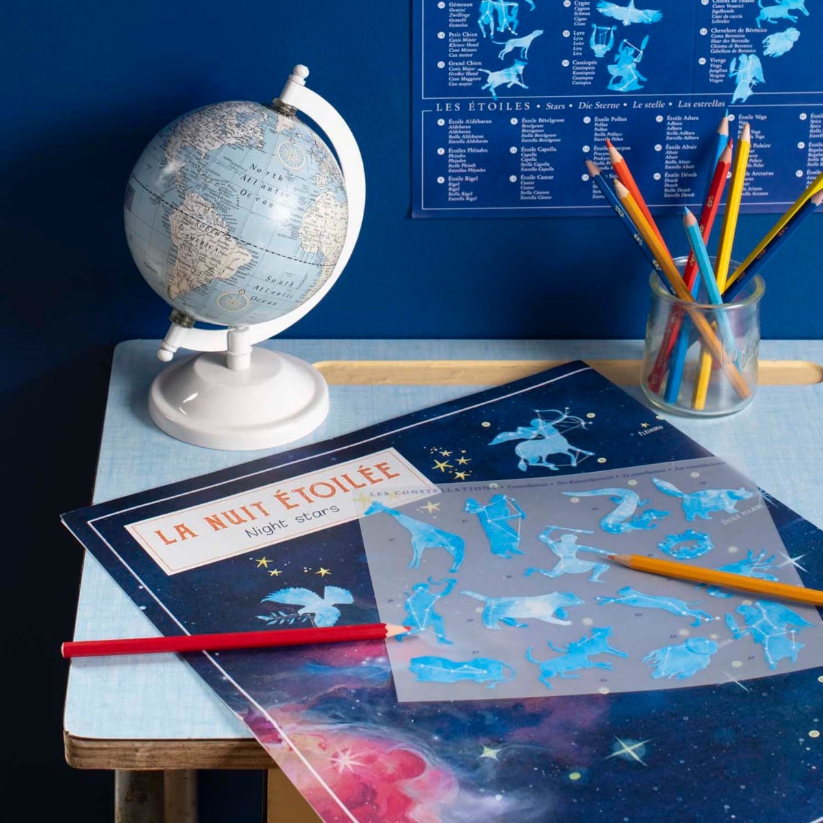 Découvrez la carte du ciel Le jardin du Moulin de Moulin Roty : un poster à compléter avec des constellations grâce à 4 planches de décalcomanies et des étoiles phosphorescentes. Idéal à partir de 6 ans.