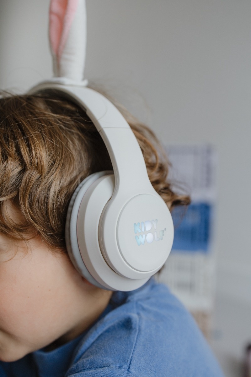 Casque Audio enfant Lapin de chez Kidywolf. Un casque Bluetooth et filaire avec des oreilles magnétiques pour les enfants dès 4 ans.