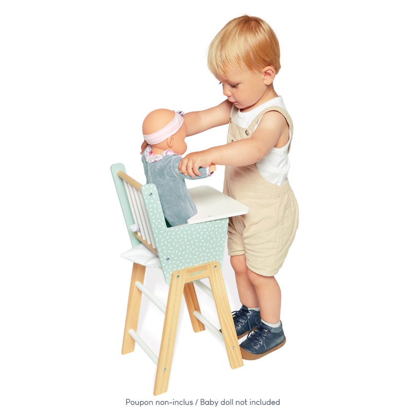 À table !! Cette belle chaise haute est parfaite pour donner le repas et prendre soin de son poupon préféré. Elle est aussi très confortable grâce à son joli coussin. Compatible avec les poupons jusqu’à 42 cm (poupon non fourni). Jouet d’imitation en bois FSCTM pour les enfants à partir de 3 ans.