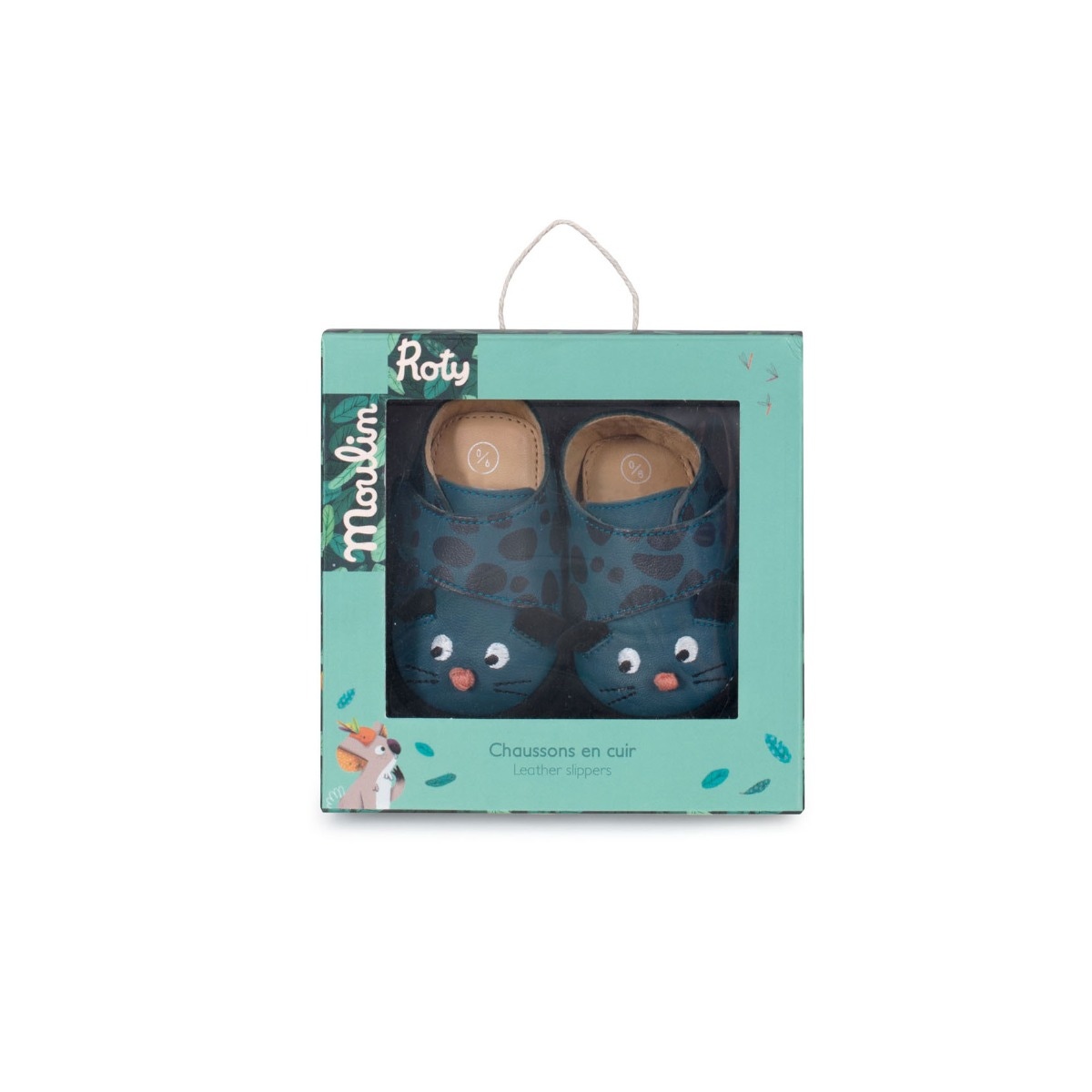 Chaussons cuir panthère bleu Dans la jungle Moulin Roty