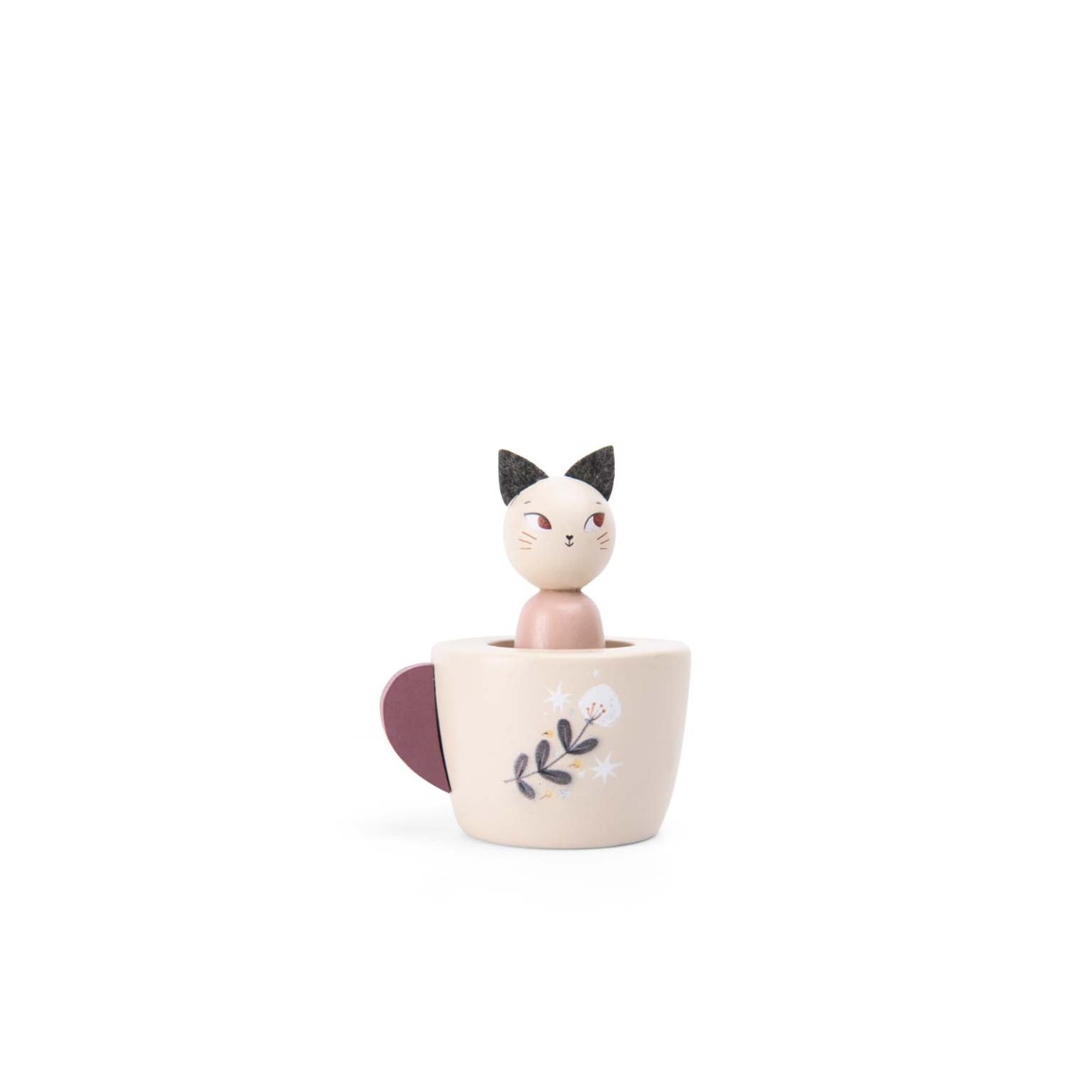 Jeu de manipulation en bois illustré de la collection Après la pluie. Regardez la tasse tourner et observez son personnage en actionnant le jeu d'engrenage. Le jeu comprend également un circuit de perles.