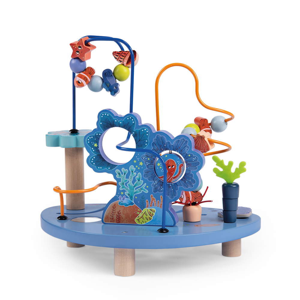 Jeu d'adresse et de manipulation en bois. Rendez-vous sous la mer avec ce circuit de perles aux couleurs et textures étonnantes. Faire glisser les animaux marins, balader le petit crabe, regarder qui se cache sous la coquille… bébé a de quoi s'occuper !