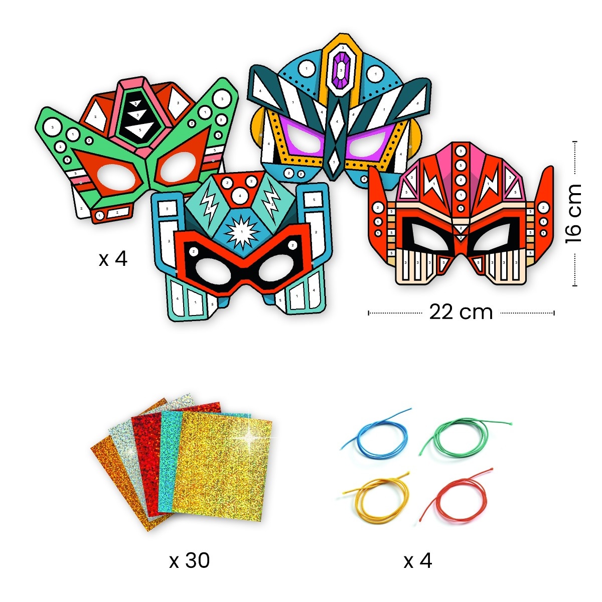 Un kit créatif pour créer 4 masques de super robots aux reflets métallisés. Grâce aux zones de colle apposées sur les masques, l'enfant dépose la feuille métallisée en suivant la numérotation indiquée sur le pas-à-pas. La matière se dépose comme par magie et les masques se parent d'éclats métalliques du plus bel effet !