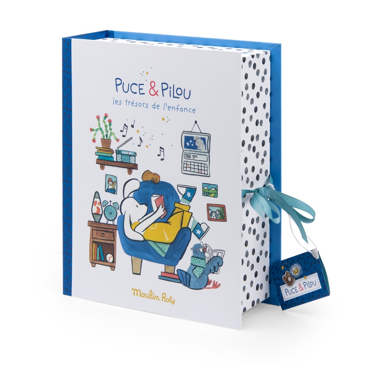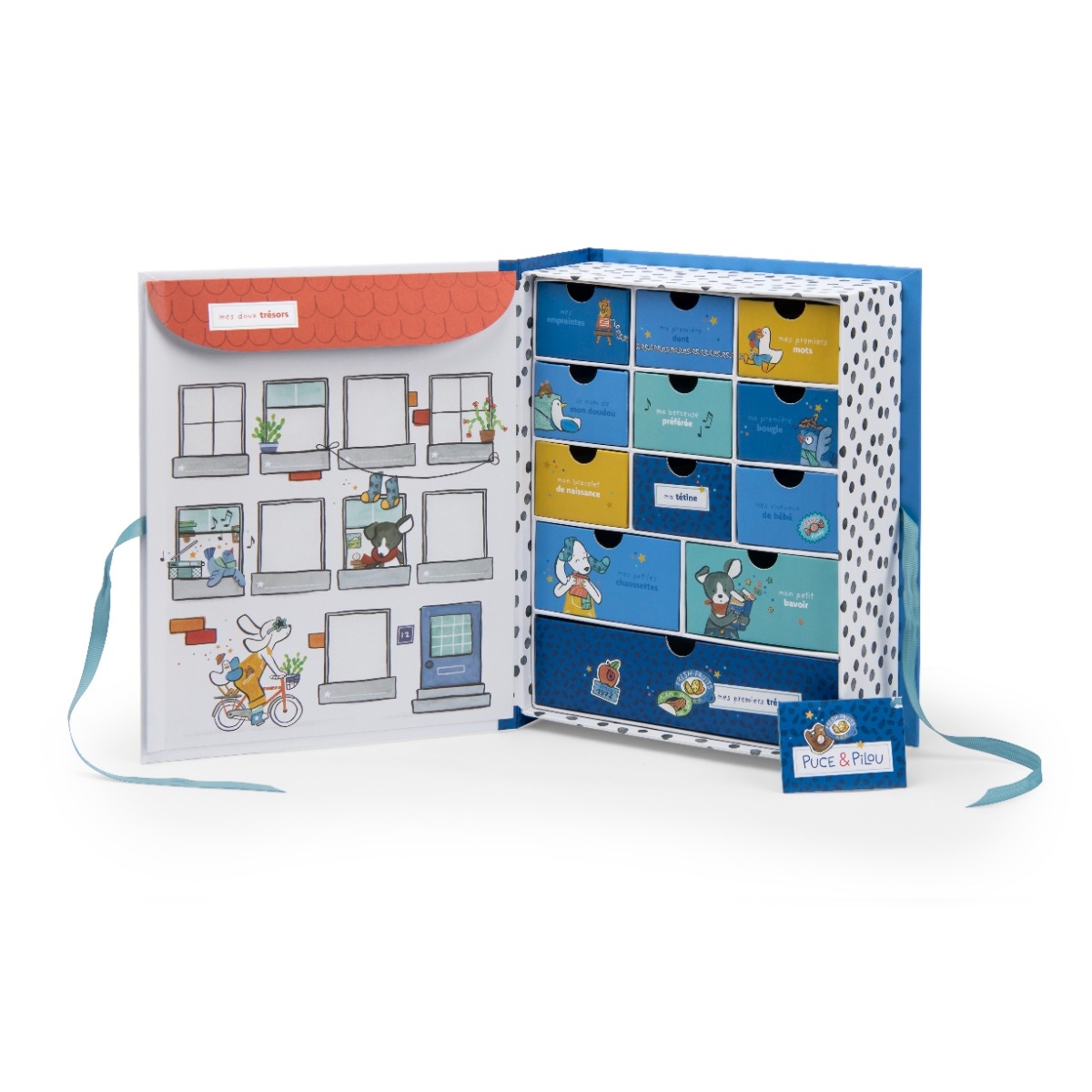 Le coffret naissance Moulin Roty Puce & Pilou est un véritable trésor pour conserver les premiers souvenirs de bébé. Ce coffret rigide, illustré avec les joyeux personnages à l'intérieur et à l'extérieur, s'ouvre sur des tiroirs illustrés où ranger précieusement toutes les étapes de l'enfance. Sa fermeture par des liens lui confère un charme particulier. Un cadeau de naissance idéal pour chérir chaque instant.