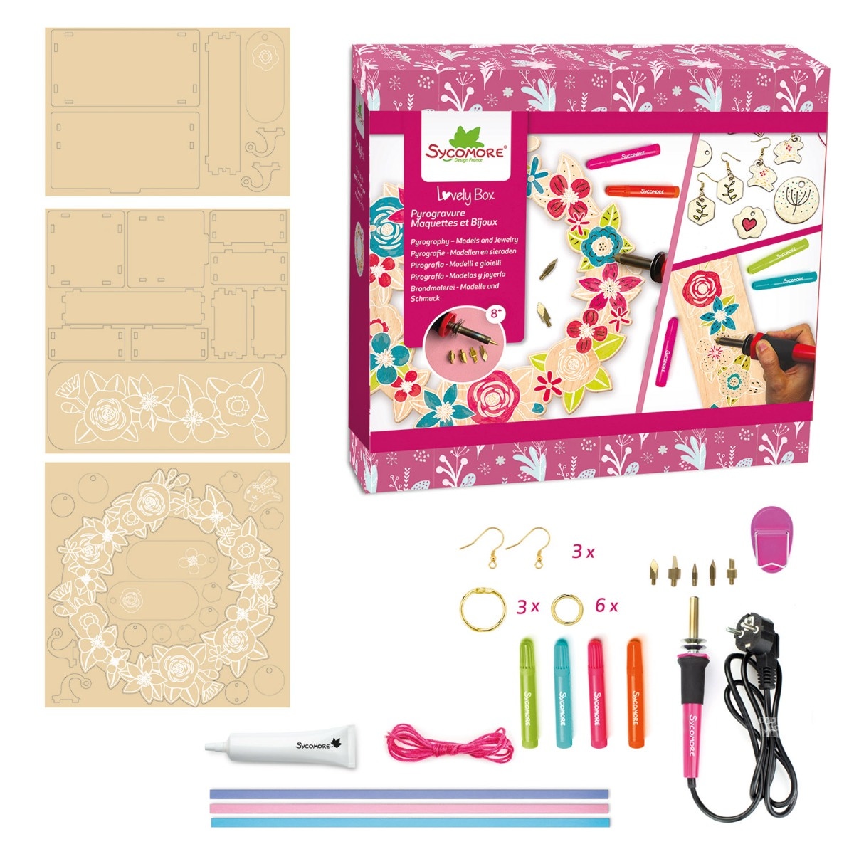 Découvrez la Lovely Box Coffret Pyrogravure Maquette et Bijoux Sycomore, un kit créatif complet pour initier les enfants aux loisirs artistiques.