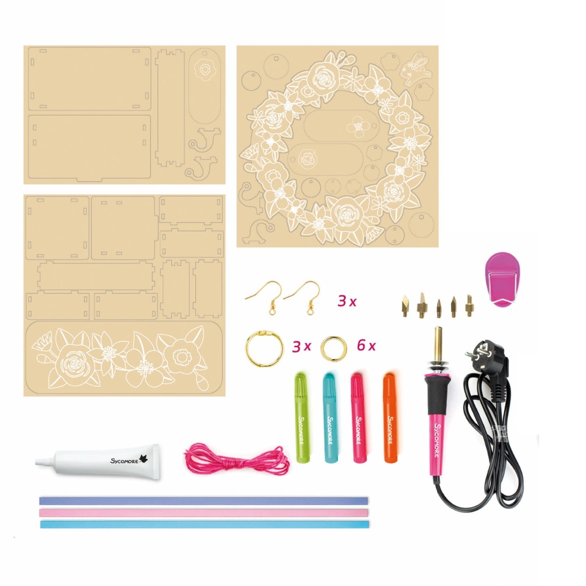 Ce coffret contient : 1 pyrograveur, 5 embouts interchangeables, 2 boîtes à bijoux, 1 couronne de fleurs, 3 marque-pages, 3 paires de boucle d’oreilles, 3 annneaux, pendentifs en bois, 1 planche d'entrainement, 4 feutres (4 couleurs : bleu, rose, vert, orange), 1 tube de colle blanche, 3 rubans, 1 cordon et 1 livret d’instructions.