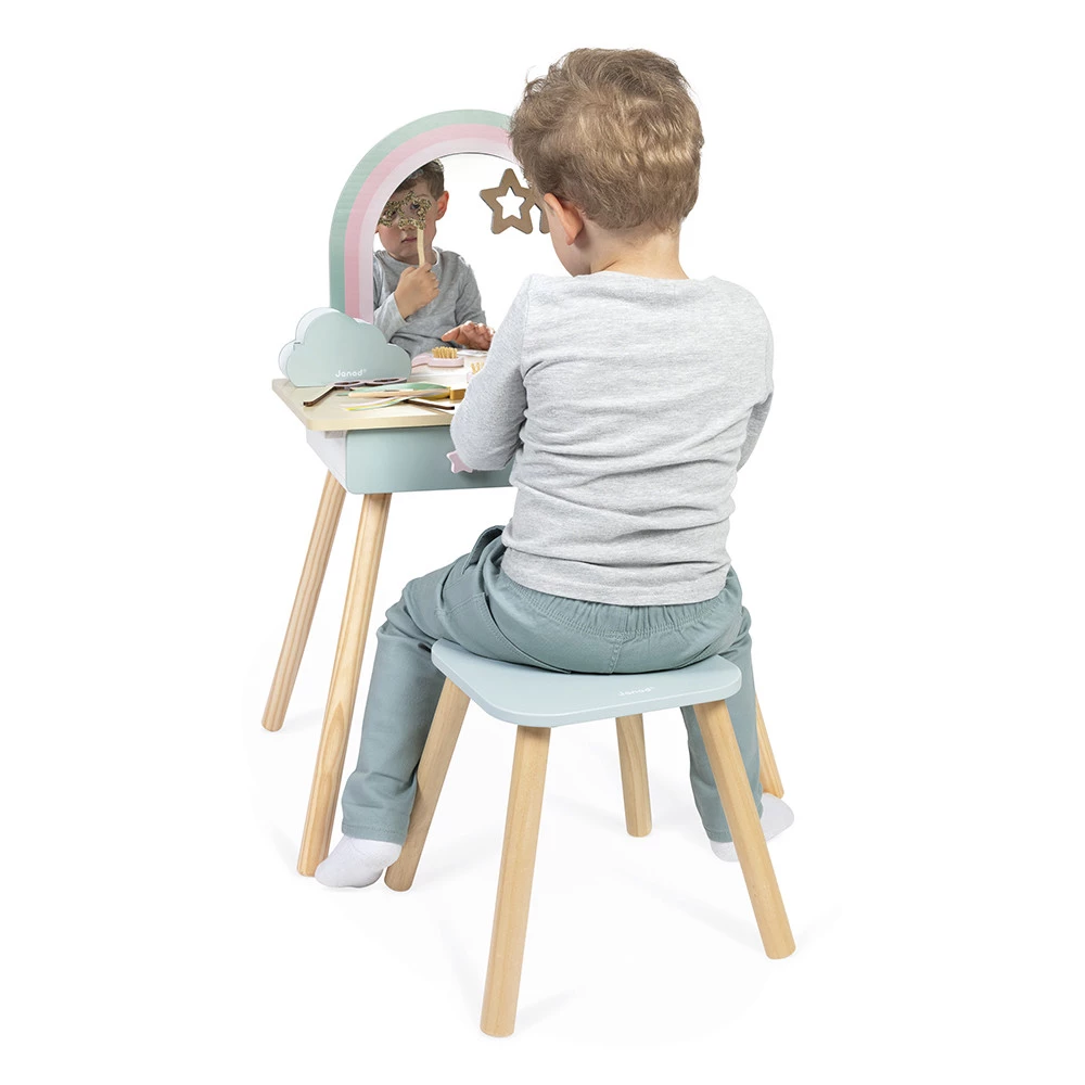 Découvrer cette sublime coiffeuse Licorne de chez Janod pour les enfants dès 3 ans. Cette grande coiffeuse, son tabouret et ses nombreux accessoires offriront à votre enfant un véritable univers de jeu et de créativité. Magique ! Elle dispose d'une trappe secrète magnétique pour cacher ses petits secrets. Également 3 accessoires de photo booth pour des heures d'amusement ! 4 magnets en forme d'étoiles et de licorne, une vraie brosse à cheveux et même une baguette magique ajoutent une touche de magie à chaque séance de jeu. Avec cette coiffeuse, votre enfant stimule son imagination, se pomponne et s'amuse comme les grands ! Jouet d’imitation en bois FSCTM.