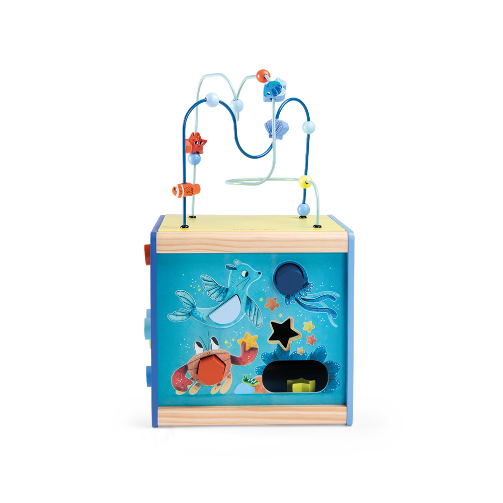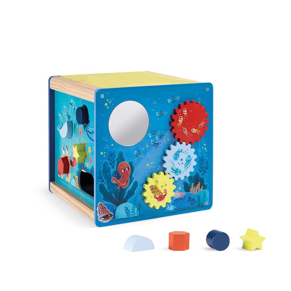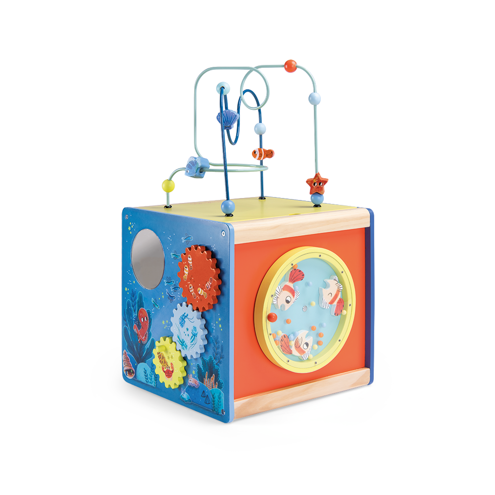 Ce cube en bois coloré invite bébé à jouer avec les animaux marins : Labyrinthe coulissant, jeu à formes, engrenages, boulier…. il prendra plaisir à découvrir les activités et les sons. Pratique, le couvercle se range à l'envers dans le cube.