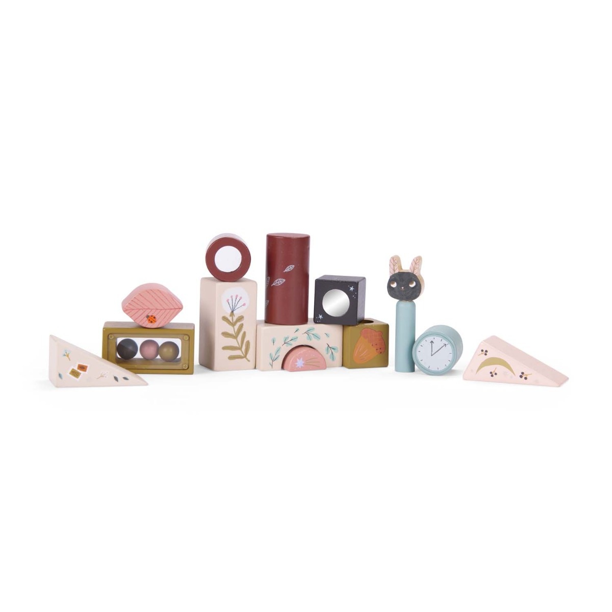 Jeu d'activités en bois illustré de la collection Après la pluie, comprenant 13 pièces de formes différentes avec petit miroir, grelot, pop-up et petites billes. Il développe la motricité de l'enfant et lui apprend les formeset les couleurs.
