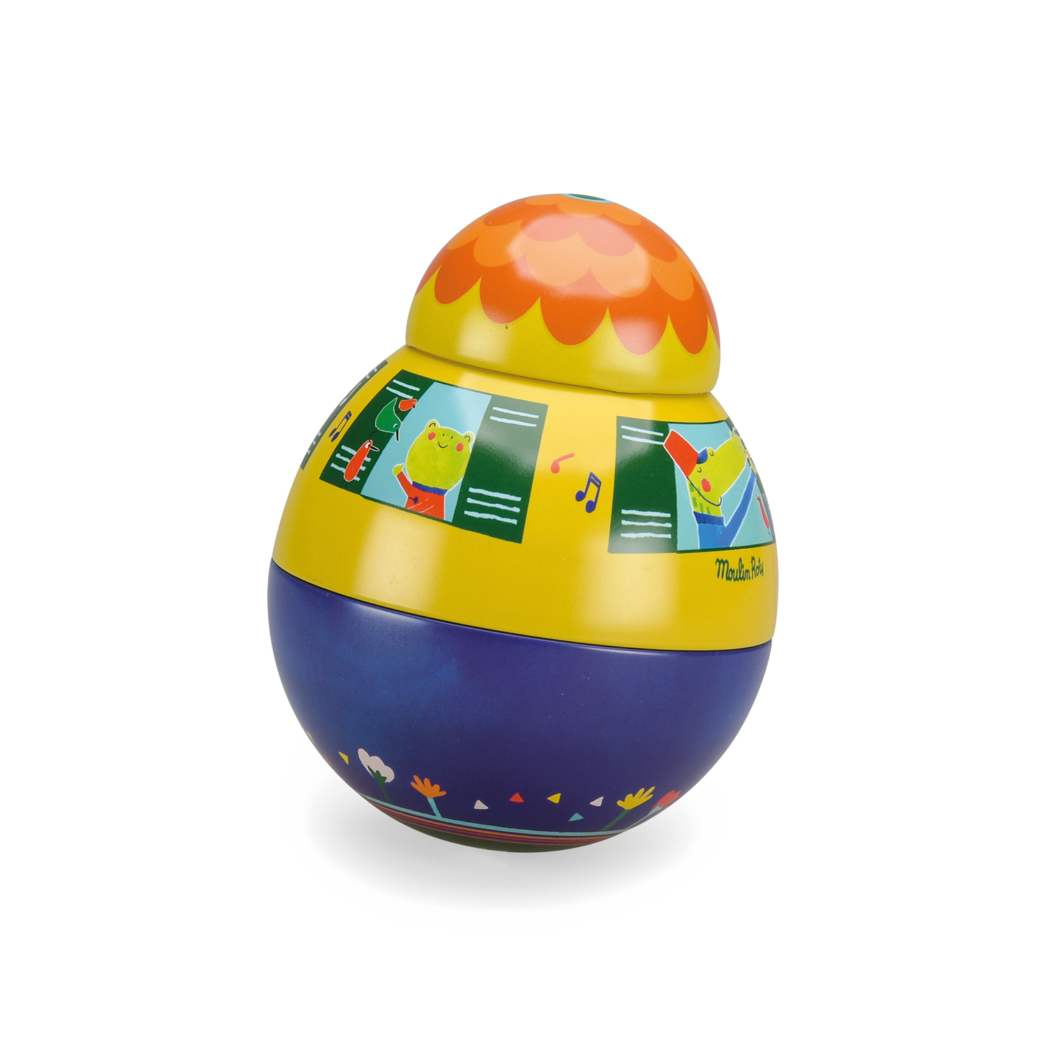 Culbuto en métal coloré, illustré d'une fanfare d'animaux joyeux et colorés. Il se balance au son d'un joyeux carillon d'avant en arrière sans jamais se renverser. Bébé va adorer le basculer dans tous les sens.
