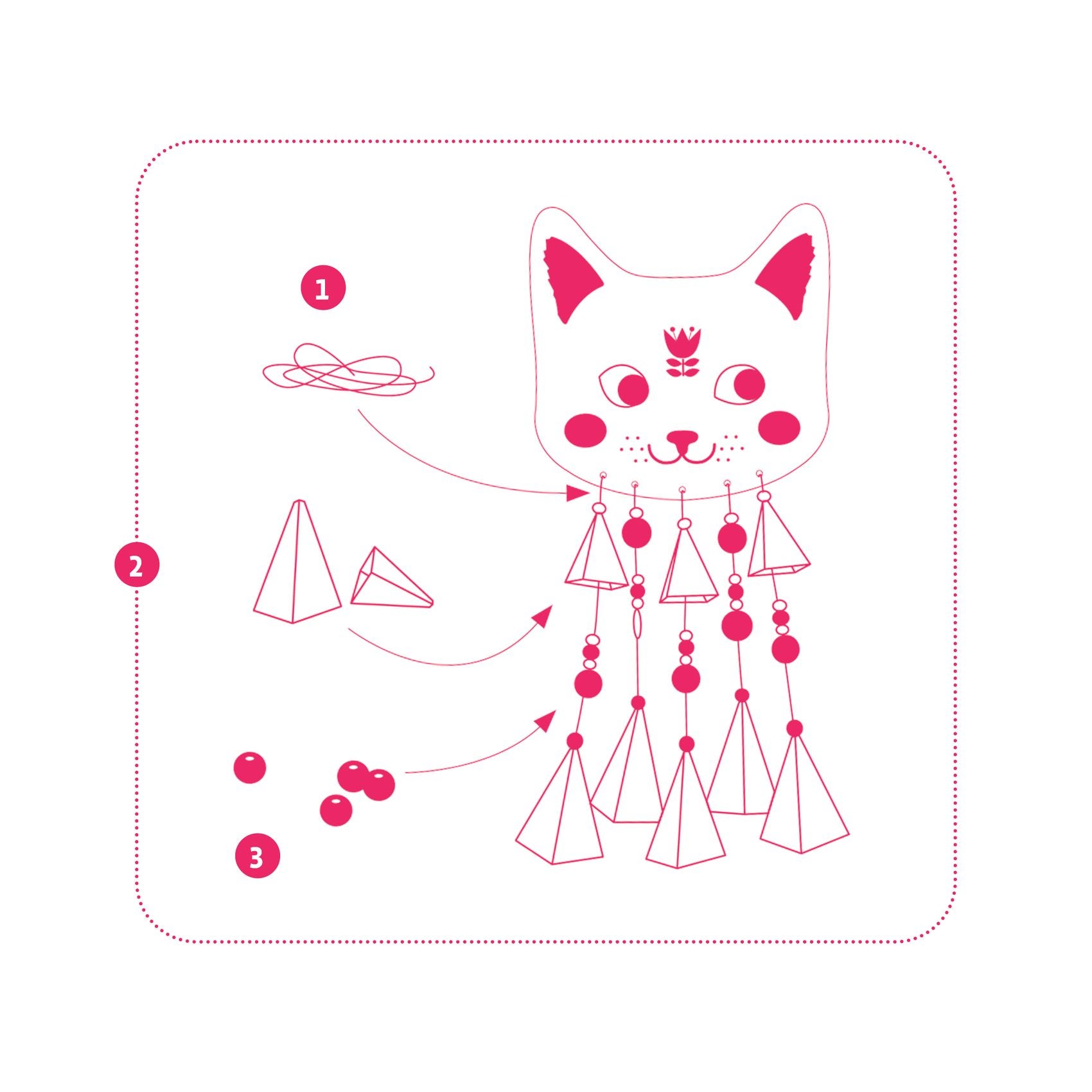 Kitty est un chat carillon à créer : grelots, perles en bois et cônes illustrés sont à enfiler sur les fils de coton cirés qui s'attachent au support fourni. Quand les fils s'agitent, le Kitty scintille de mille feux et tinte agréablement.