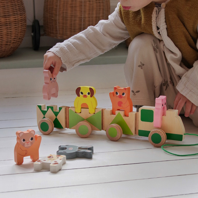 Un joli train coloré en bois avec des passagers animaux de la ferme. L’enfant s’amuse à placer les sept animaux sur les quatre wagons et les promène à l’aide du lacet. Lorsqu’ils descendent du train, les animaux tiennent debout et l’enfant peut s’amuser à jouer avec autant qu’il le souhaite ! Contenu : 1 train de 4 wagons et 7 animaux en bois (1 chat, 1 chien, 1 souris, 1 vache, 1 âne, 1 lapin, 1 cochon).