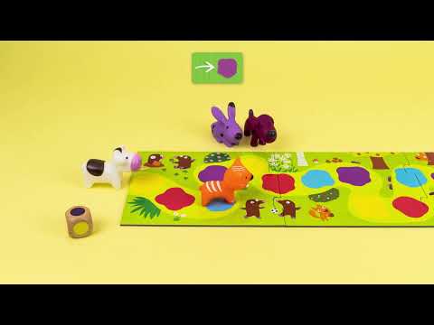 Un jeu de parcours spécialement conçu pour les tout-petits dès 2 ans ½, avec un plateau de jeu puzzle d'une longueur de près de 1,22 mètres. D'adorables petits animaux se promènent sur le chemin. Qui va arriver le premier au bout ? Le dé indique le rouge ! Le petit chien peut avancer jusqu’à la prochaine case rouge ! Contenu : 1 plateau de jeu en carton de 6 pièces de puzzle à assembler, 4 figurines en plastique souple (chat, lapin, chien, vache), 1 dé en bois, 15 jetons en carton. Règle du jeu en 10 langues.