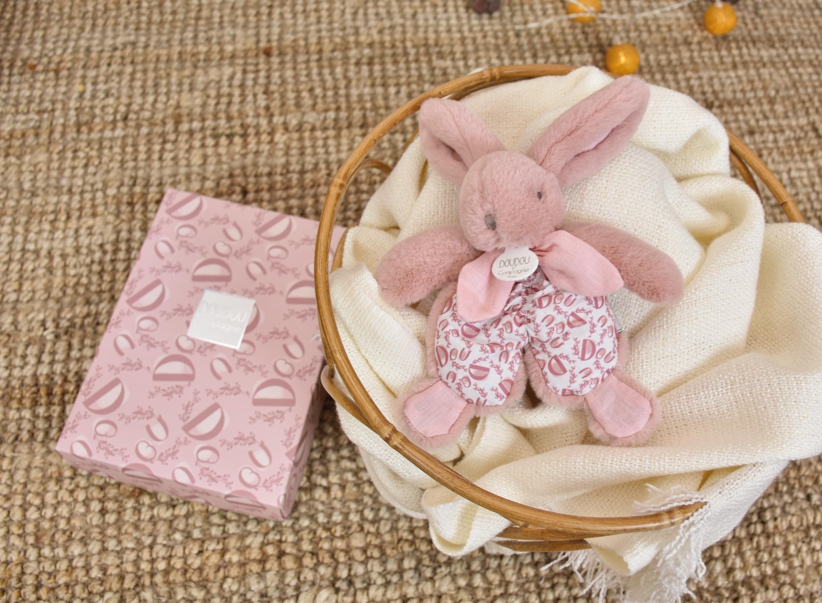 Au clair de la lune, MON AMI DOUDOU…un lapin habillé d'un foulard en lin, reflettant le chic à la française ! De couleur rose, d'une forme originale grâce à son tissu froncé, il a des bras généreux pour se faire câliner. Son gonflant, son poil soyeux invitent à le serrer contre soi ou profiter simplement de sa présence, de jour comme de nuit. On retrouve également la matière lin sur ses pattes légèrement rembourées, très agréable toucher ! Son imprimé exclusif très frais est porteur d'un mot magique : DOUDOU !