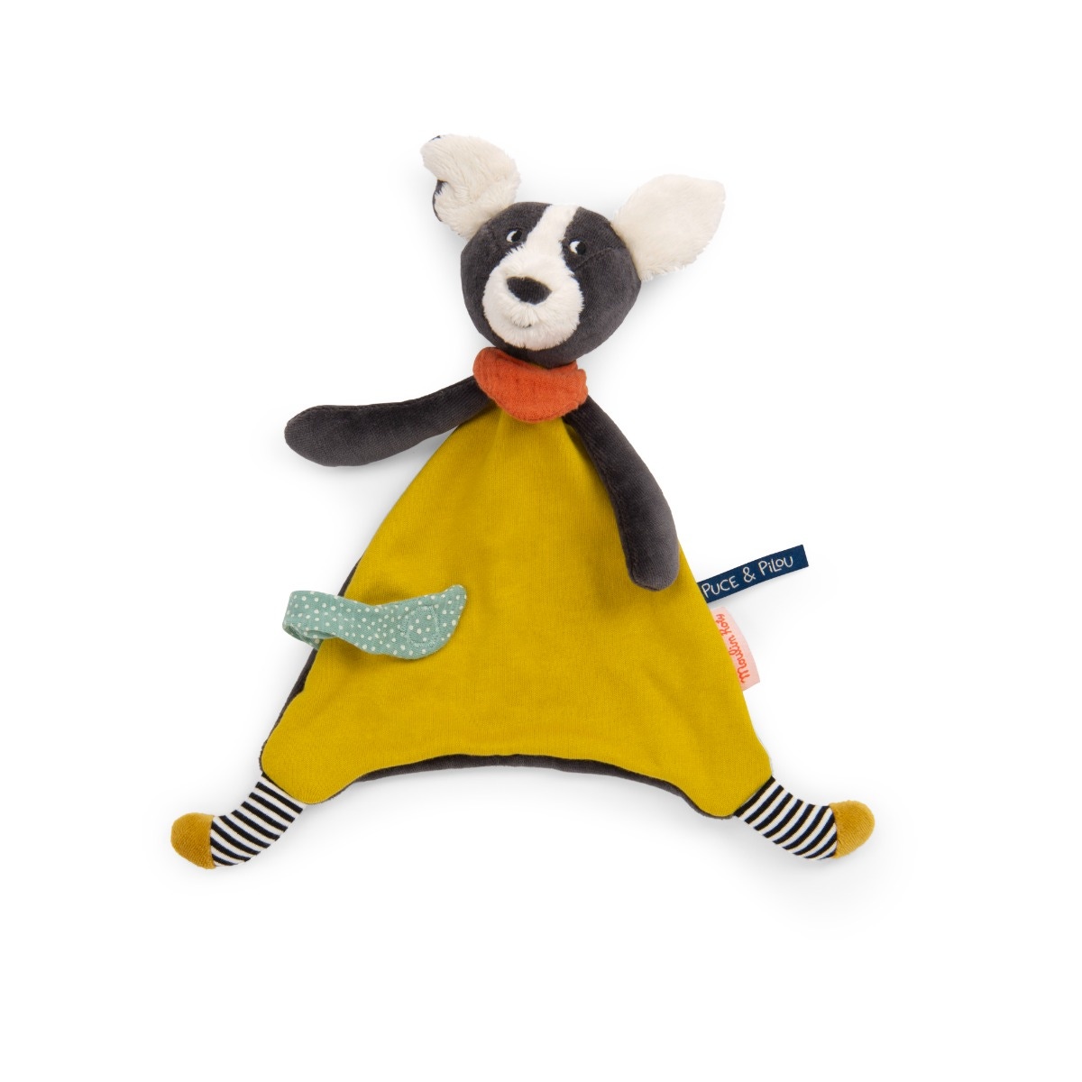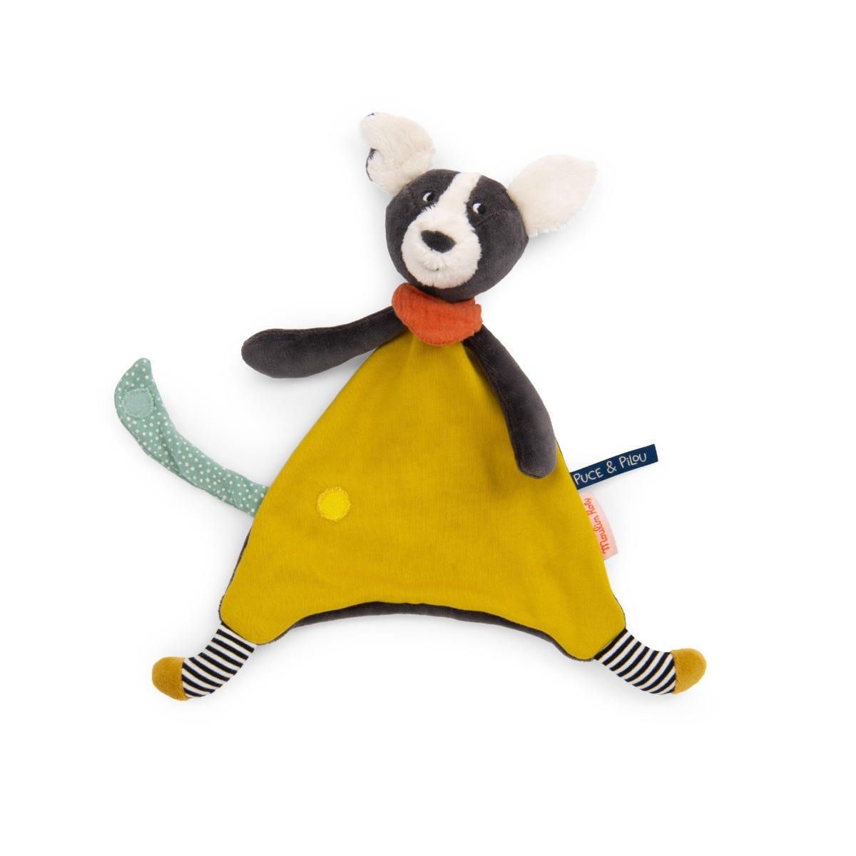 Nous proposons ce doudou Moulin Roty, représentant le chien Puce de la collection Puce & Pilou. Puce est un personnage qui fait partie d’un univers des années 90, avec des couleurs joyeuses et dans une ambiance urbaine.