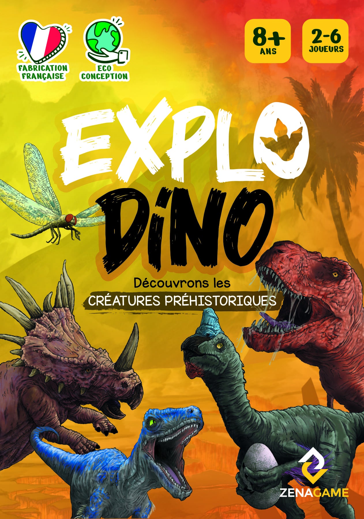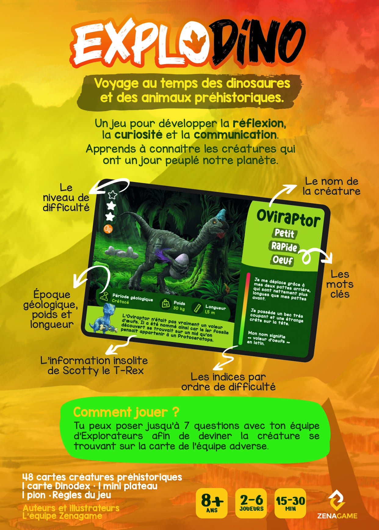 Chaque carte dino comporte de informations sur une créature préhistorique : 3 mots clés - 3 indices de difficulté décroissante - les informations sur le poids, la longueur et l'époque préhistorique de la créature - une information insolite sur la créature préhistorique.