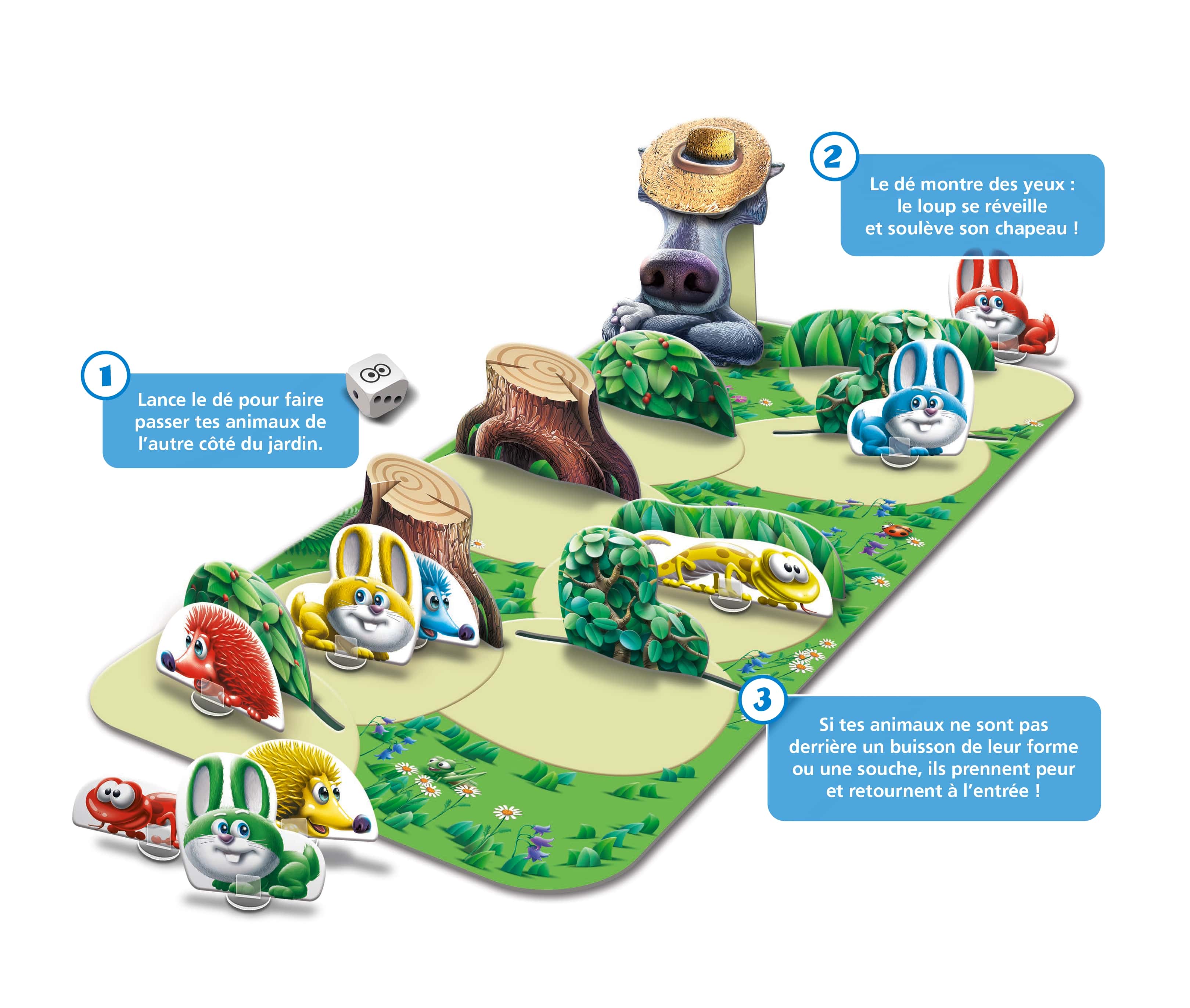 2. Le dé montre des yeux : le loup se réveille et soulève son chapeau !