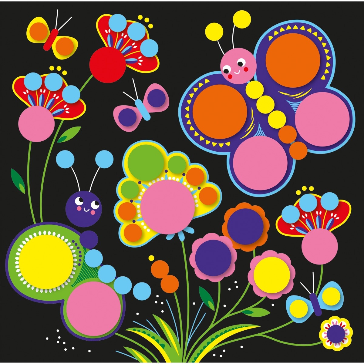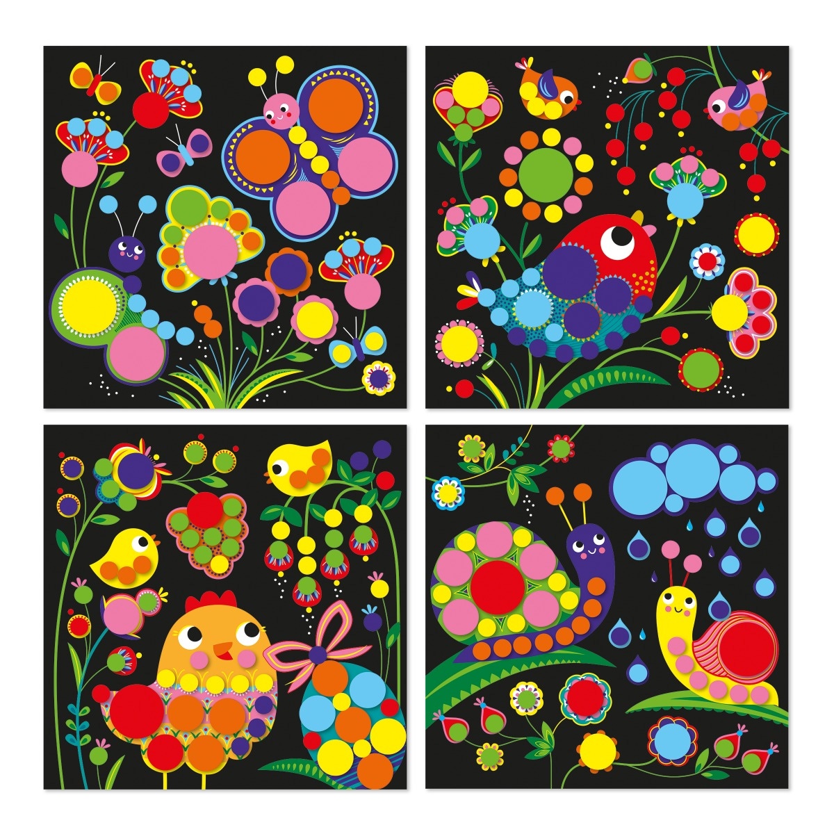 C'est le printemps ! Cette pochette créative permet de réaliser 4 tableaux à compléter avec des gommettes rondes de différentes tailles et couleurs. Elle contient 4 tableaux sur fond noir, 7 planches de gommettes rondes faciles à détacher et 1 feuillet avec les instructions et les modèles. Cette activité permet de développer sa dextérité et sa patience et nécessite environ 10 minutes par tableau. Elle est idéale pour les enfants à partir de 3 ans.