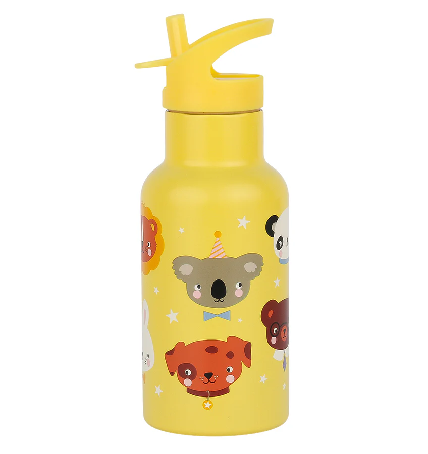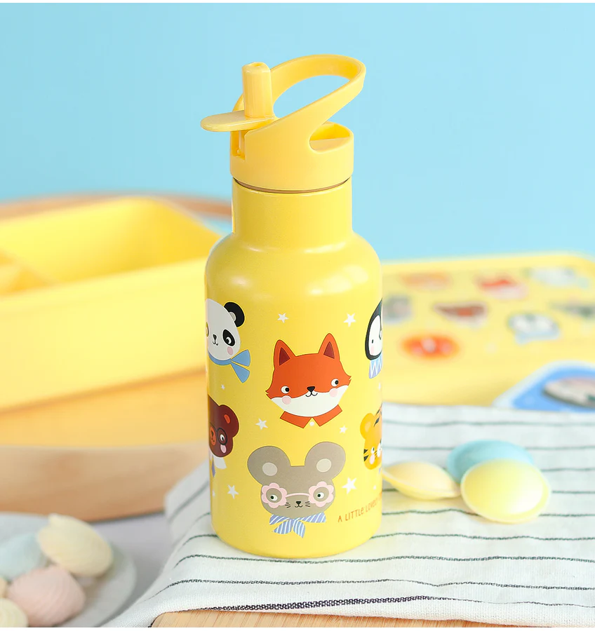 Gourde en métal jaune animaux de chez A Little Lovely Company. Bouteille thermos à double paroi en acier inoxydable. La bouteille de 350 ml est livrée en standard avec un bec verseur et une paille pour les boissons froides. Un bouchon à vis en inox pour boissons chaudes est vendu séparément.