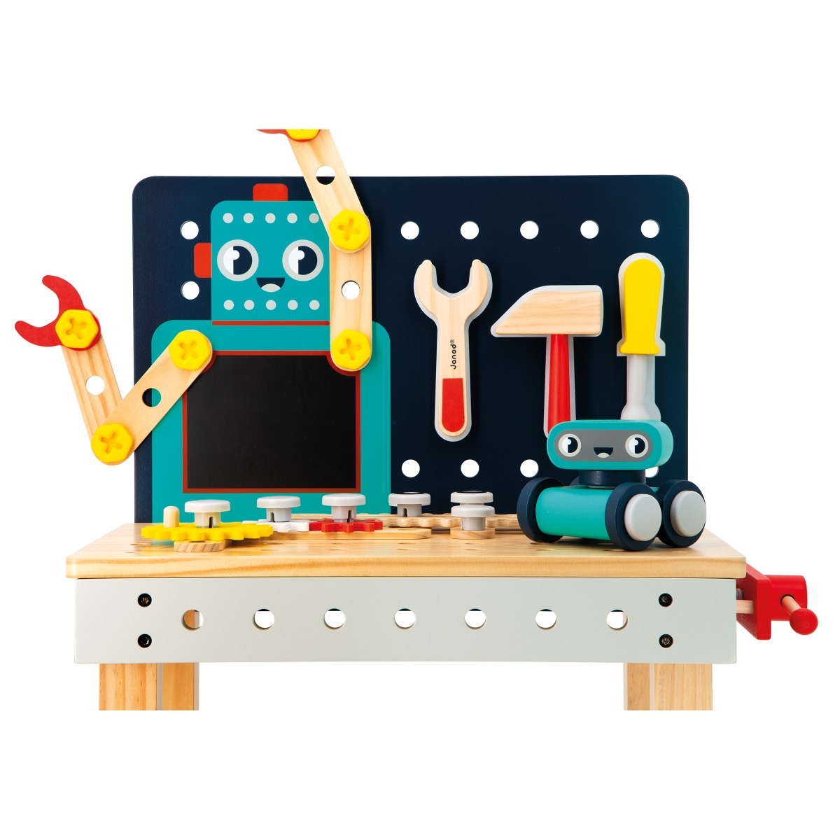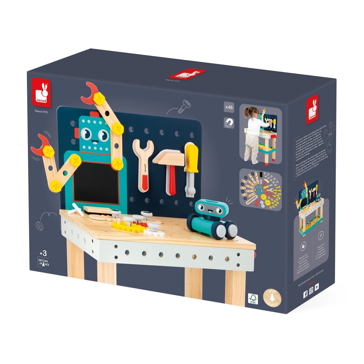 | Contenu du produit | 1 établi, 30 accessoires plastique, 19 accessoires bois, 1 brosse, 2 craies, 3 outils magnétiques, 1 robot de 7 pièces, 1 modèle |