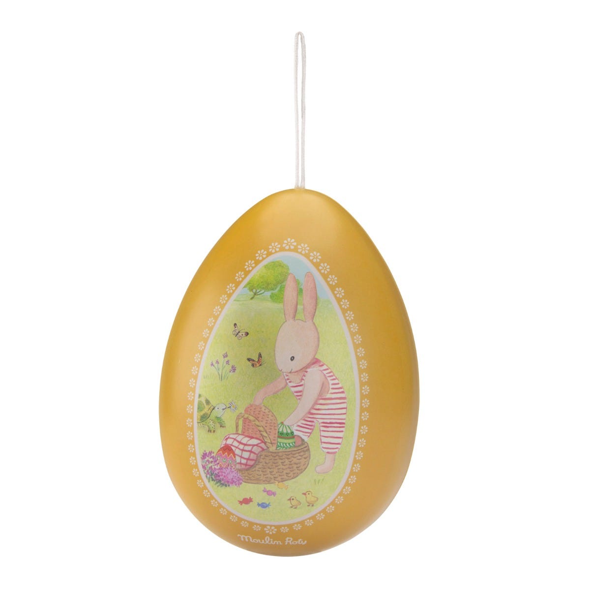 Voici un oeuf en métal jaune de 19 cm joliement décoré avec les illustrations de la Grande Famille de Moulin Roty.