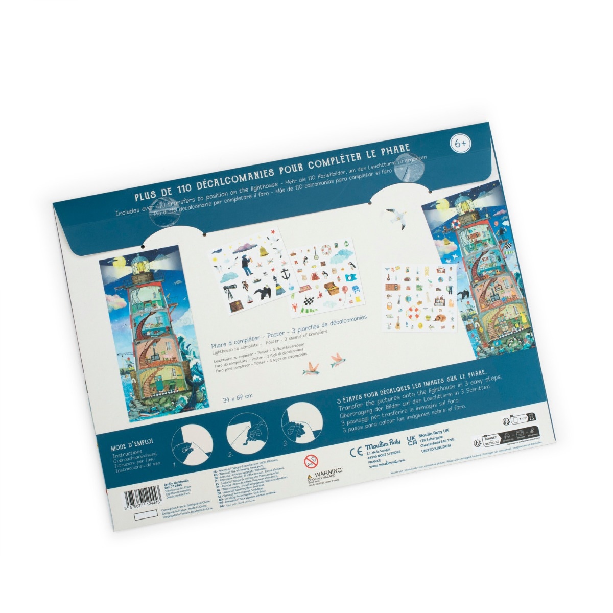 Découvrez le grand phare avec décalcomanies Le Jardin du Moulin de Moulin Roty, une activité créative idéale pour les enfants dès 4 ans.