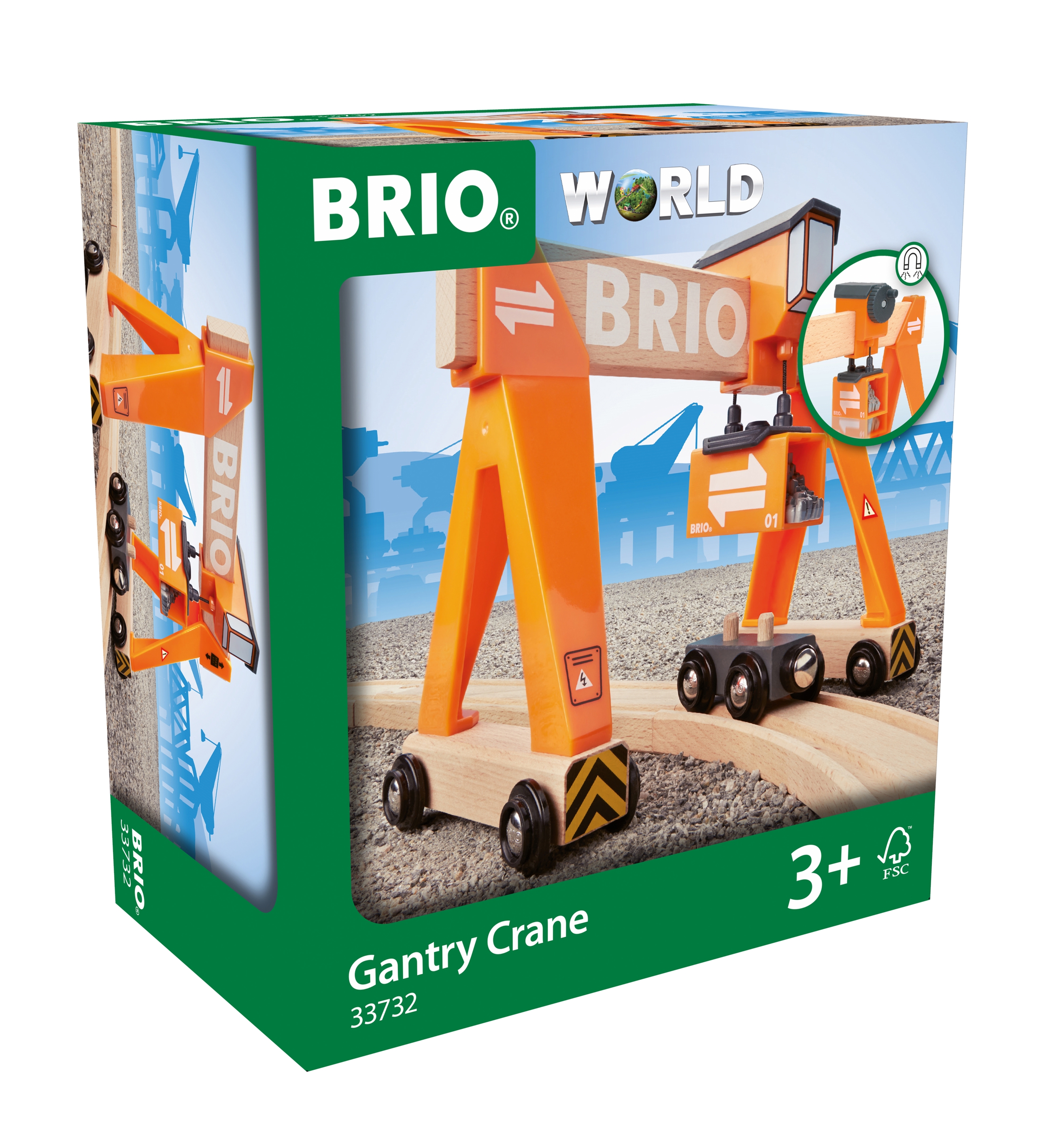 Soulever, transporter et charger n’a jamais été aussi facile ! La grue-portique est équipée de roues pour être utilisée à la fois sur les rails et en dehors. Une fois en place, soulevez ou libérez la charge en tournant la manivelle. Vous pouvez également faire coulisser la cabine horizontalement. Dès 3 ans. Fabriqué à partir de bois de hêtre certifié FSC®®, de plastique de haute qualité et incluant des détails métalliques raffinés.