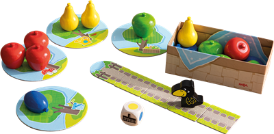 Les joueurs essayent ensemble de cueillir les fruits dans les arbres avant que le corbeau n’arrive au verger.Le dé indique le fruit qu’il faut cueillir ou bien si le corbeau avance d’une case-chemin en direction du verger.