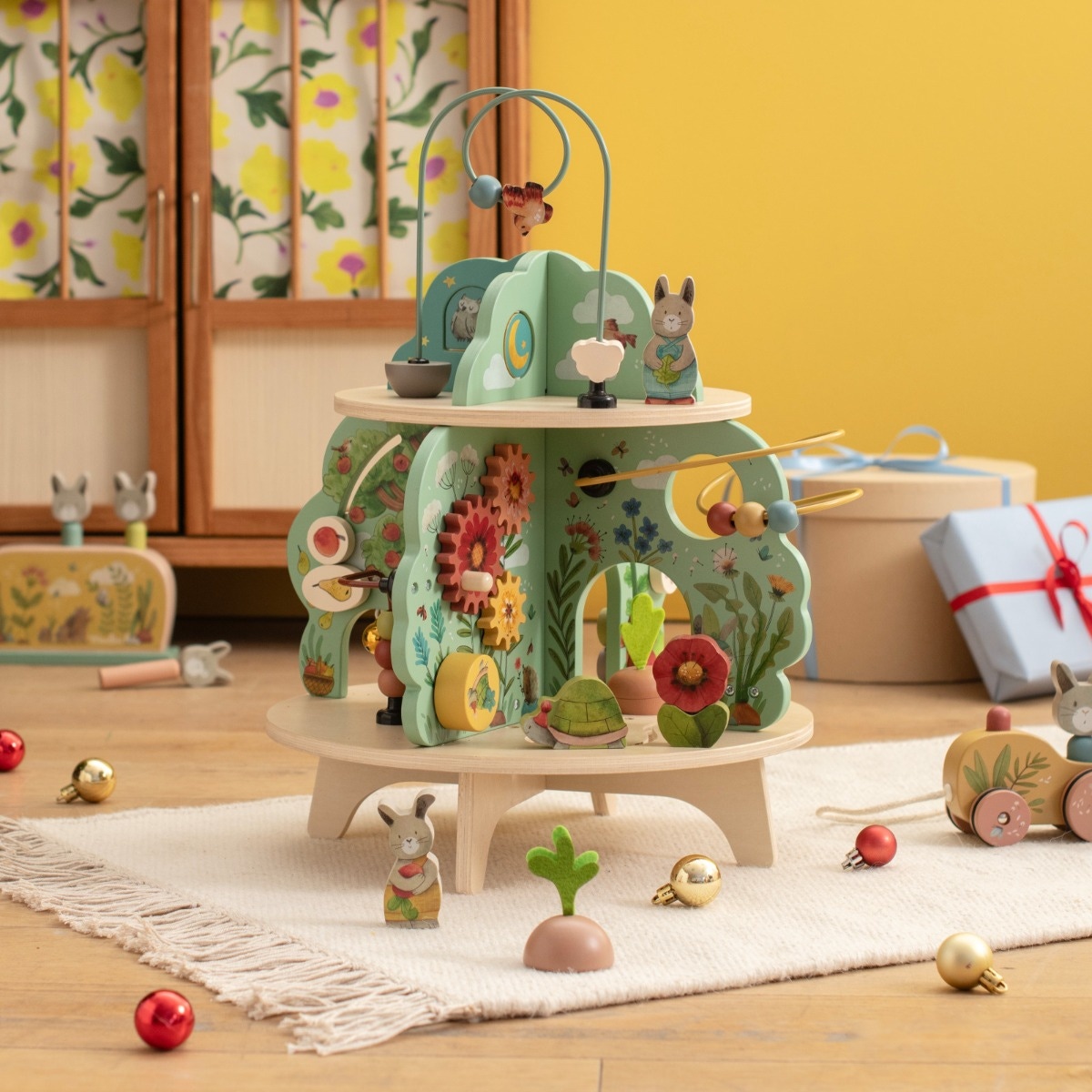 Jardin en bois multi-activités, composé de 4 univers joliment illustrés. Idéal pour l'éveil et les premiers apprentissages des tout-petits avec ses activités : grelot, engrenages, boulier, labyrinthes, miroir, feutrine pour la découverte de la texture.