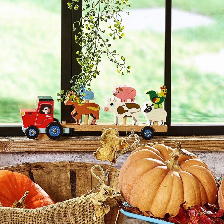 De jolis animaux en bois à empiler sur la remorque du tracteur. Illustré par Ingela P.Arrhenius. À partir de 2 ans.