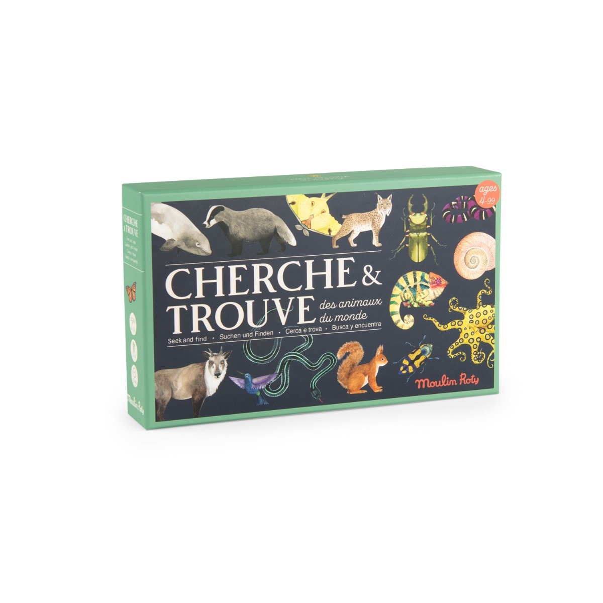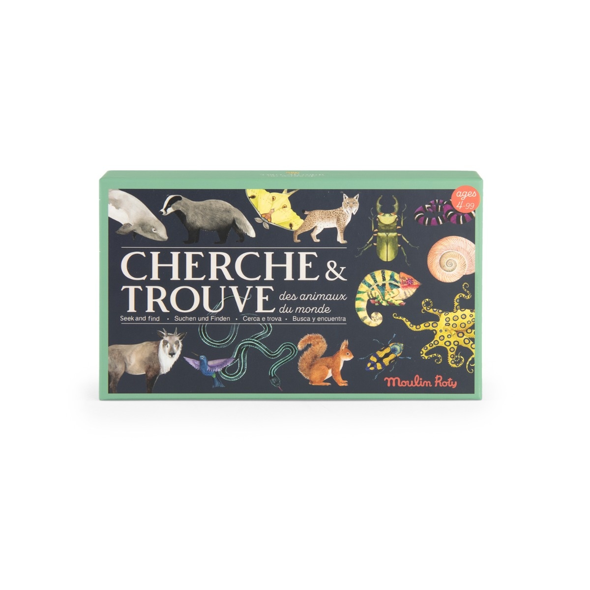 Découvrez le jeu Cherche et trouve les animaux du monde de Moulin Roty pour les enfants dès 4 ans. Ce jeu d'observation et de rapidité est fabriqué en France. Pour pimenter le jeu et gagner plus de points, piochez une carte curiosité. A chaque partie, changez le plateau de jeu en modulant les 9 planches. Un poster avec le nom des animaux est inclus.