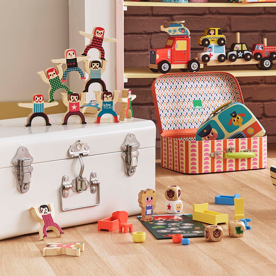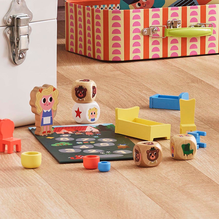 | Contenu du produit | 1 plateau, 1 pion Boucle d'Or, 2 dés en bois, 3 lits, 3 chaises, 3 bols en bois, 1 pochon en tissu |