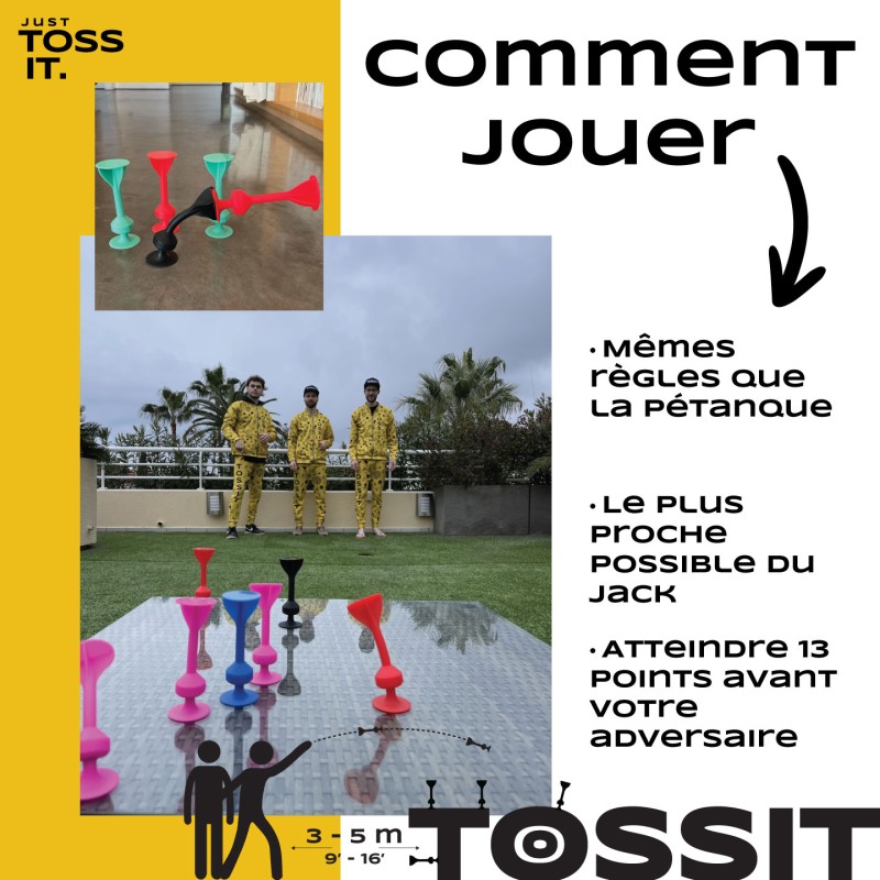 Redécouvrez la pétanque avec le TOSSIT Family Pack, une version encore plus fun et polyvalente pour des parties à 2, 3 ou 4 joueurs ! Ce pack complet comprend 12 fléchettes en silicone réparties en 4 couleurs, parfait pour multiplier les modes de jeu : classique, en équipe, par couleurs ou avec vos propres règles imaginées. Le principe reste simple et addictif : lancez vos fléchettes souples et tentez de vous rapprocher du Jack (la fléchette noire) comme au jeu de boules traditionnel. Pimentez chaque manche en empilant les fléchettes (+3 points), en touchant celles de vos adversaires (+1 point) ou en les expulsant du terrain ! Robuste, lavable et 100 % en silicone alimentaire sans BPA, TOSSIT se joue partout : sol, mur, table, vitre, en intérieur comme en extérieur. Compact et facile à transporter, il vous suit en vacances, en pique-nique ou chez des amis. Avec TOSSIT Family Pack, transformez chaque lieu en terrain de jeu et partagez des moments inoubliables en famille ou entre amis !