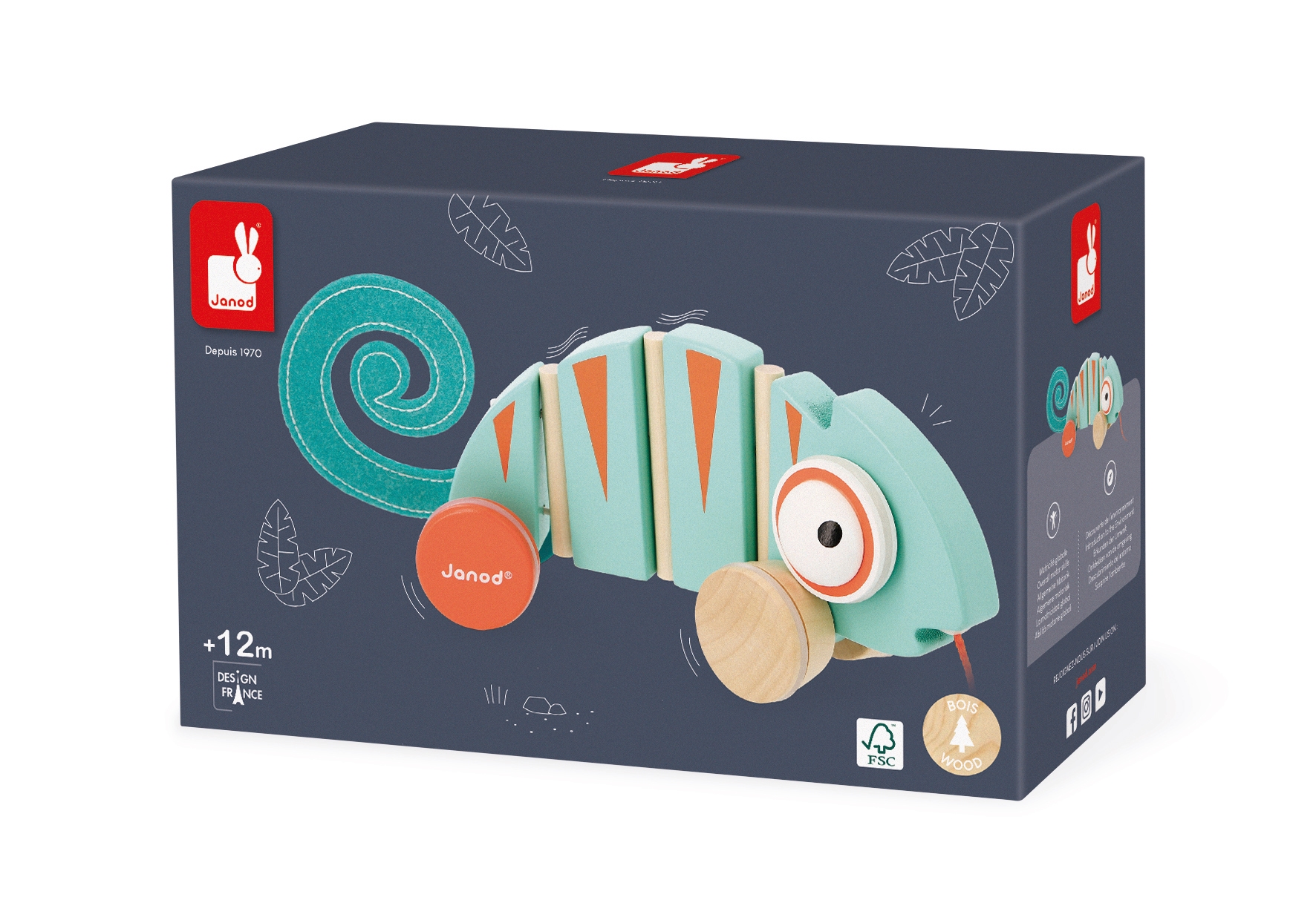 Tous en balade avec ce joli caméléon coloré ! Tout en avançant, ses yeux roulent sur eux-mêmes, de quoi ravir votre enfant ! Parfait compagnon pour inciter votre enfant à marcher et lui permettre de développer sa motricité globale. Jouet en bois FSCTM et peinture à l'eau. Jouet à tirer pour les enfants à partir de 12 mois. Pour créer cette gamme nous avons pris la direction des tropiques à la recherche d’évasion, d’exotisme et de contraste. Pour illustrer au mieux cette nature sauvage, nous avons réuni des animaux joyeux aux couleurs vitaminées et des éléments végétaux aux teintes apaisantes.