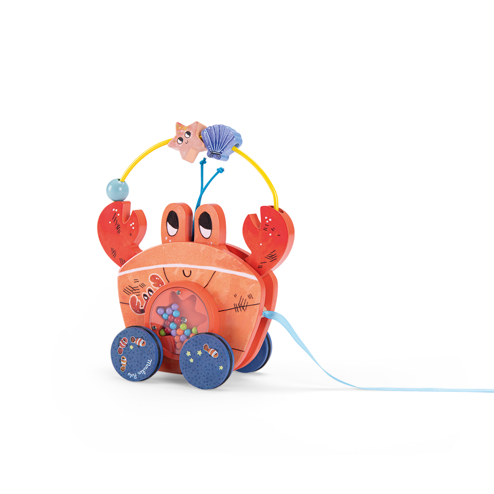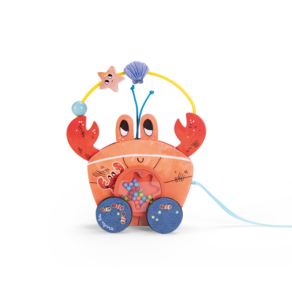 Crabe à tirer en bois. Tony jongle avec les coquillages. il suffit de tirer sur le ruban pour le voir se dandiner au rythme des billes qui tourbillonnent sur son ventre. Bébé va en pincer pour ce petit crabe plein de surprises qui le suivra partout !