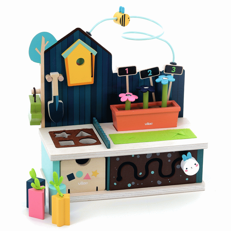 Lorsque votre enfant s’installe devant notre jardin en bois multi-activités, il va faire appel à de nombreuses capacités : concentration, dextérité, patience, motricité fine. Cette dernière, à l’inverse de la motricité globale, est l’art de manier des objets, d’utiliser ses mains et ses doigts pour attraper. Avec ses nombreux accessoires à manipuler, pousser, tirer, faire tourner, notre jardin offre un choix d’activités adaptées aux enfants à partir de 18 mois.